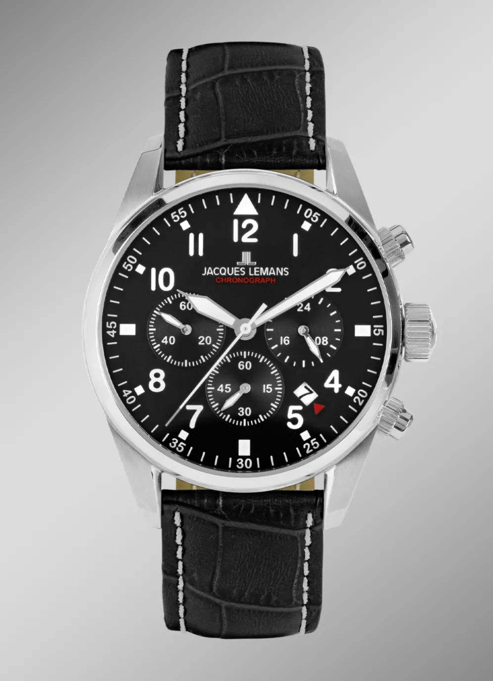 Zeitlose Eleganz gepaart mit schlichter Sportlichkeit – so präsentiert sich dieser Chronograph mit Quarzwerk und gefällt mit seinem klassischen Gehäuse mit 42mm Durchmesser aus massiv Edelstahl. Das gut strukturierte, schwarze Zifferblatt mit Chronoringen und roten Details, besticht optisch durch eine Kombination aus arabischen Ziffern und Indexes, einer Datums- und 24-Stundenanzeige, Minuten- und Sekundenzähler und einer Stoppfunktion.