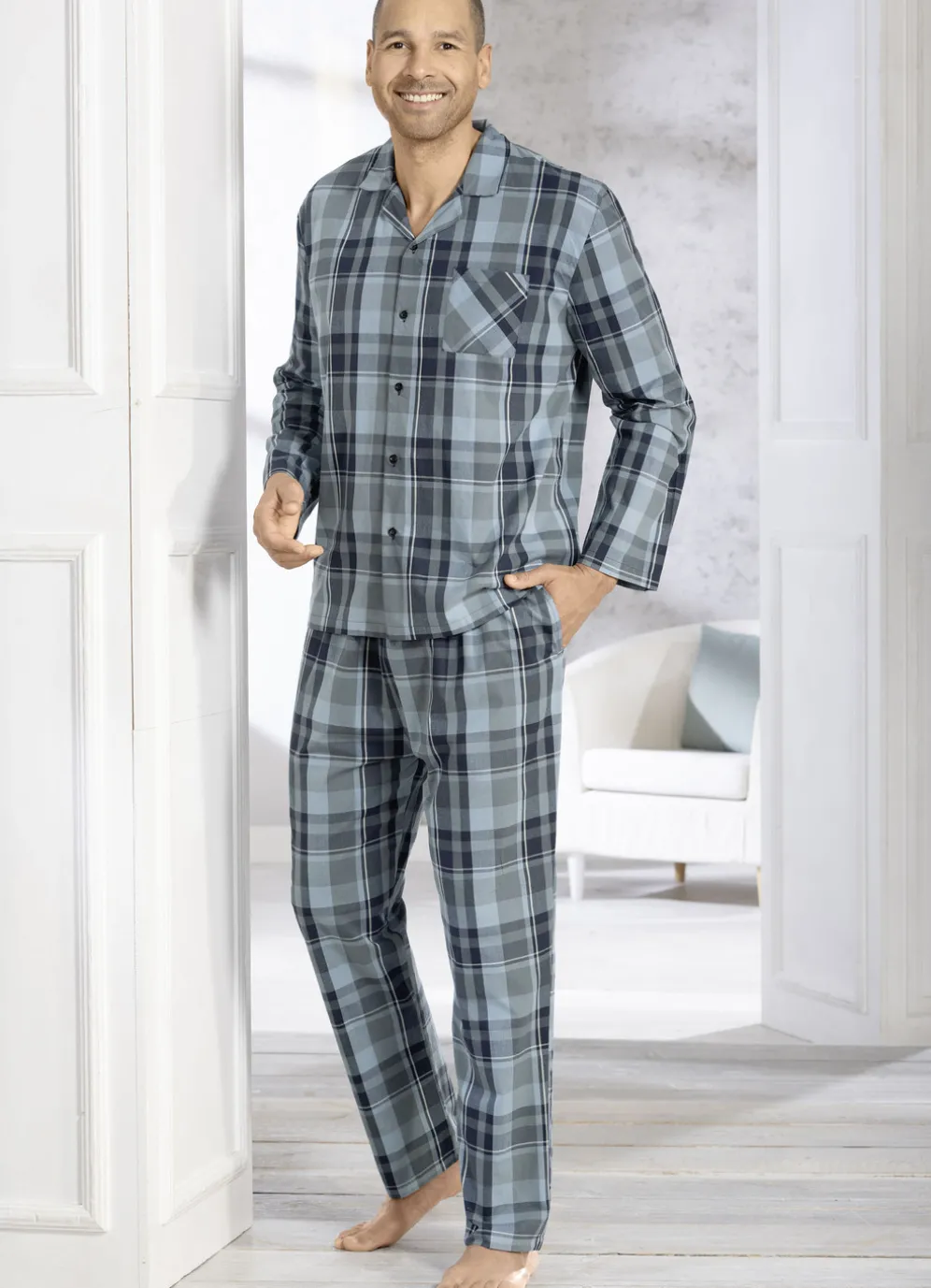 Attraktiver „Comte“-Schlafanzug in Rauchblau-Marine-Bunt mit Karodessin! Durchgeknöpftes Oberteil mit Reverskragen sowie aufgesetzter Brusttasche. Lange Hose mit Dehnbund sowie Seitentaschen.