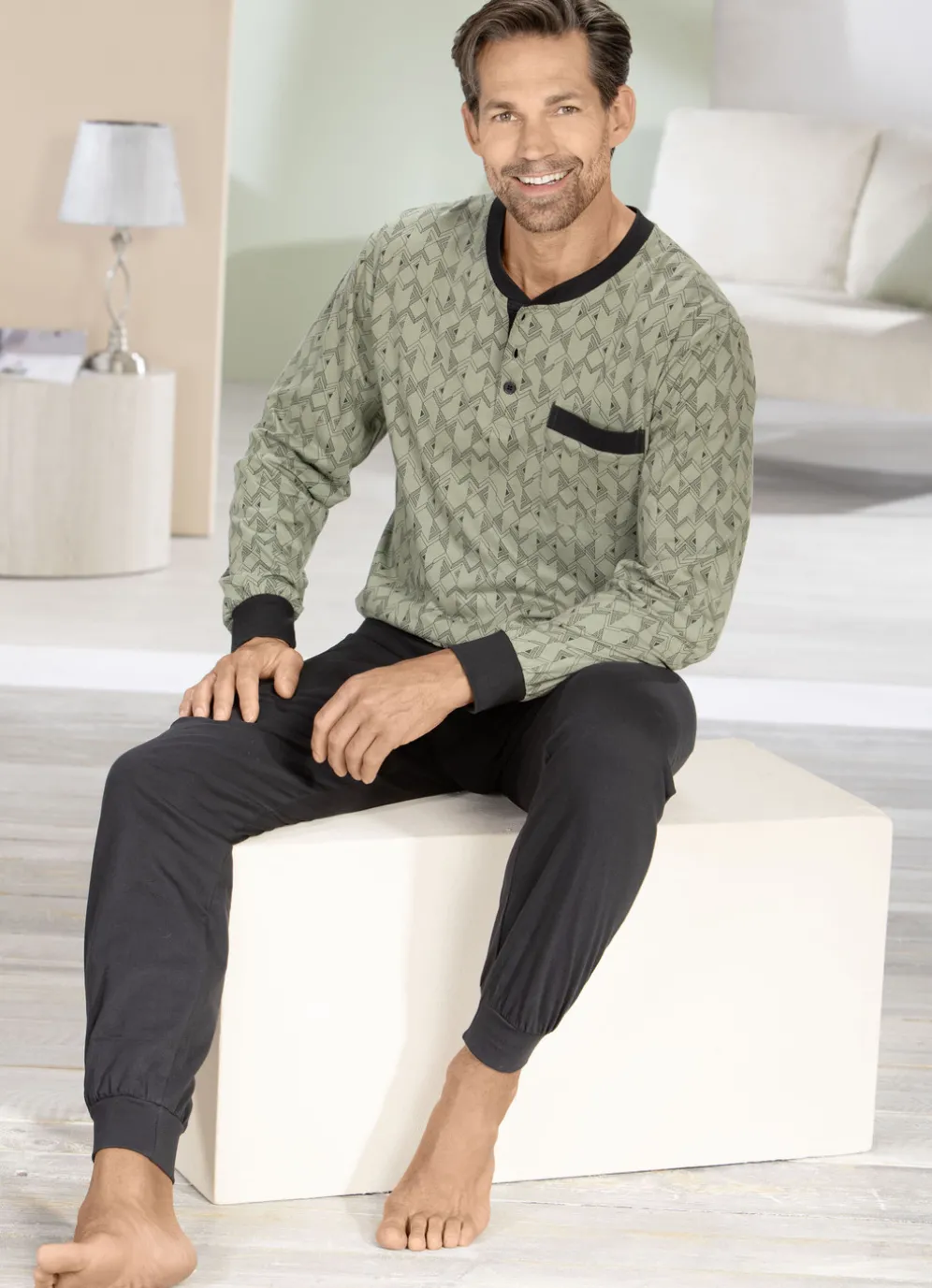 Comte Schlafanzug mit Knopfleiste und Bündchen in Oliv-Schwarz und in Größe 48.