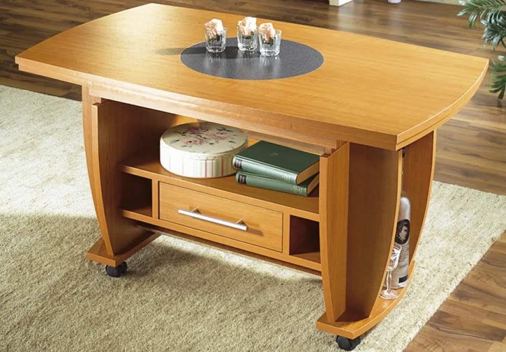 Couchtisch auf Rollen mit Stein-Optik-Einlage in der Ausführung Feste Platte und in Kirsche.