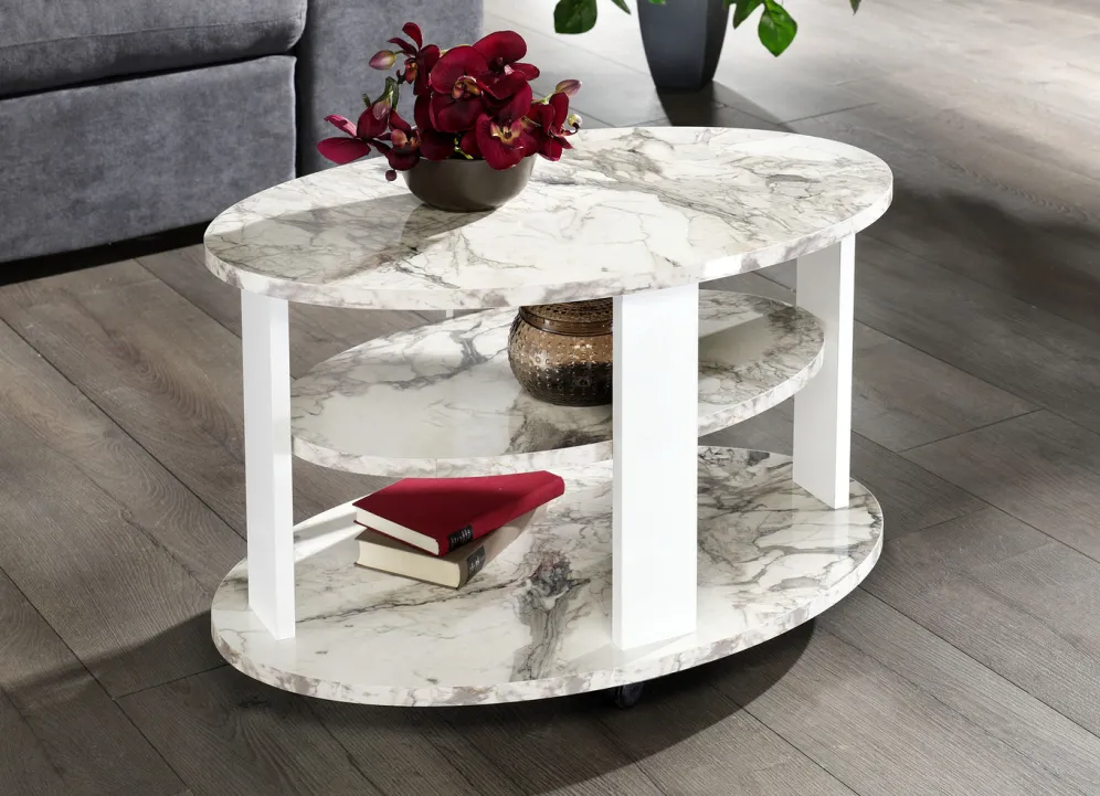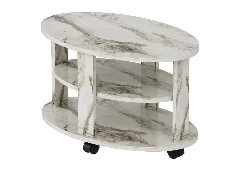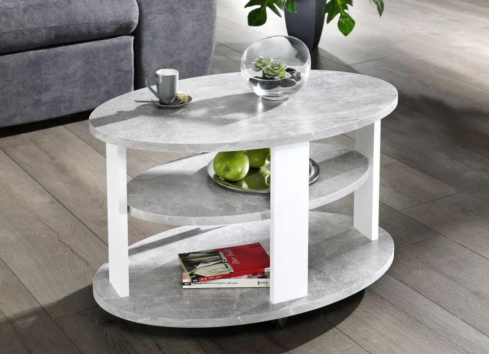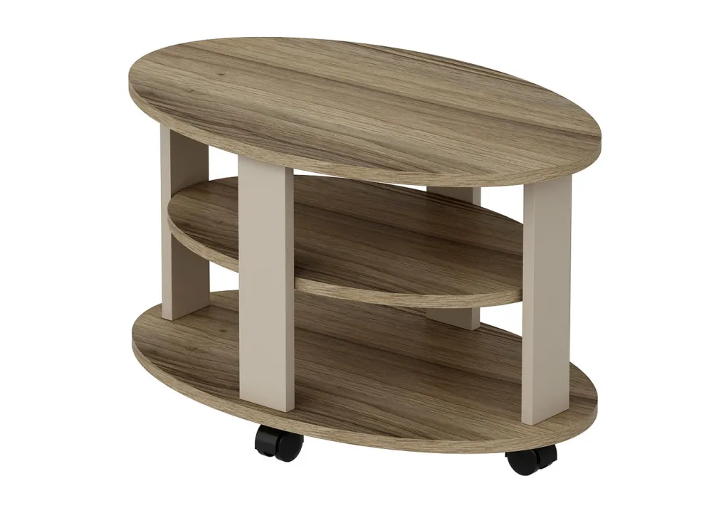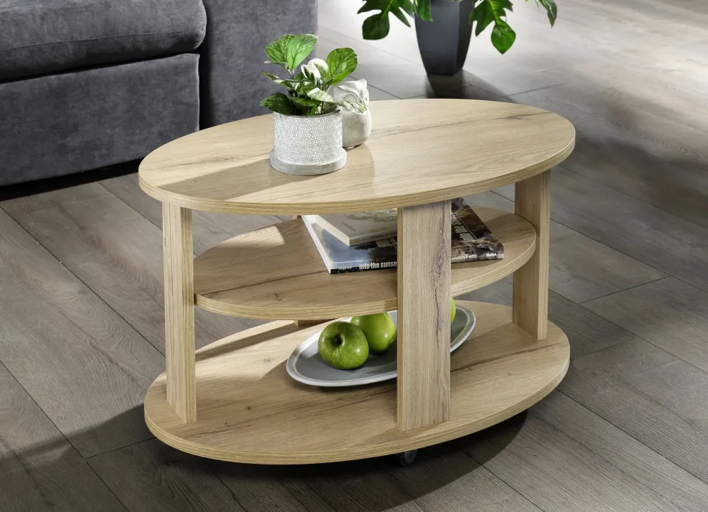 Eleganter, ovaler Couchtisch auf 4 praktischen Rollen. Mit robuster, melaminharzbeschichteter Tischplatte. Diese ist kratzfest, leicht zu reinigen und besonders geschützt gegen verblassen. Mit 2 geräumigen Ablagen unter der Tischplatte. Maße: B72xH42xT45 cm. Mit Aufbau-Anleitung zur einfachen Selbstmontage