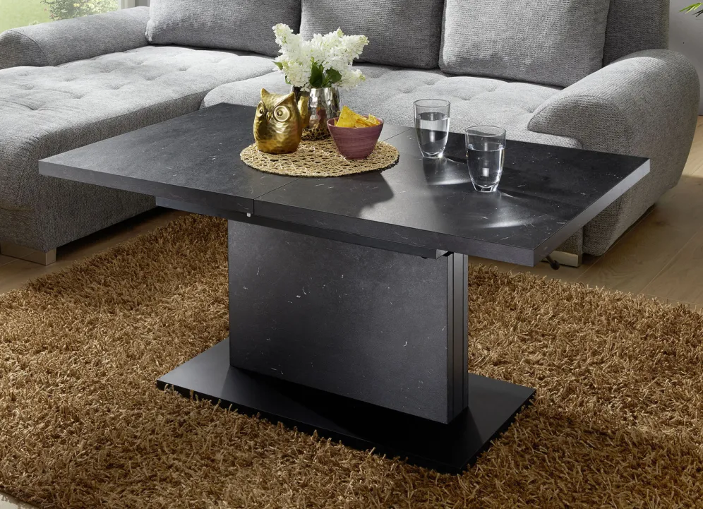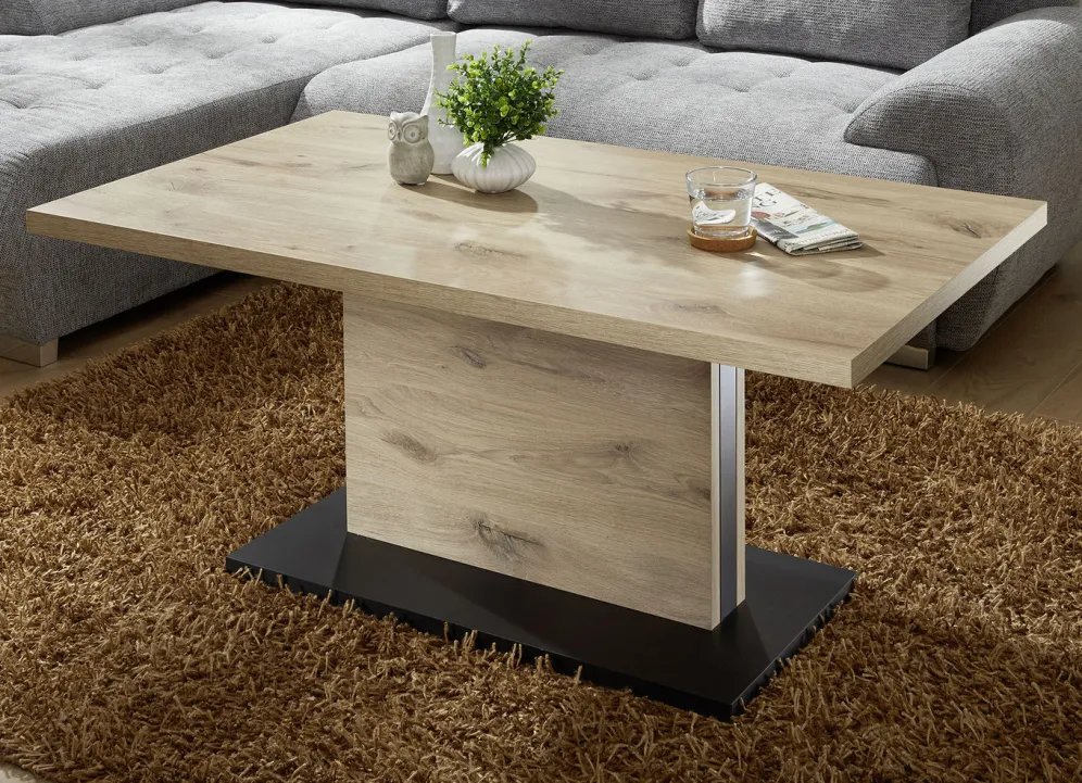 Couchtisch mit raffinierter Liftfunktion in der Ausführung Höhenverstellbar und in Asteiche-Schwarz.