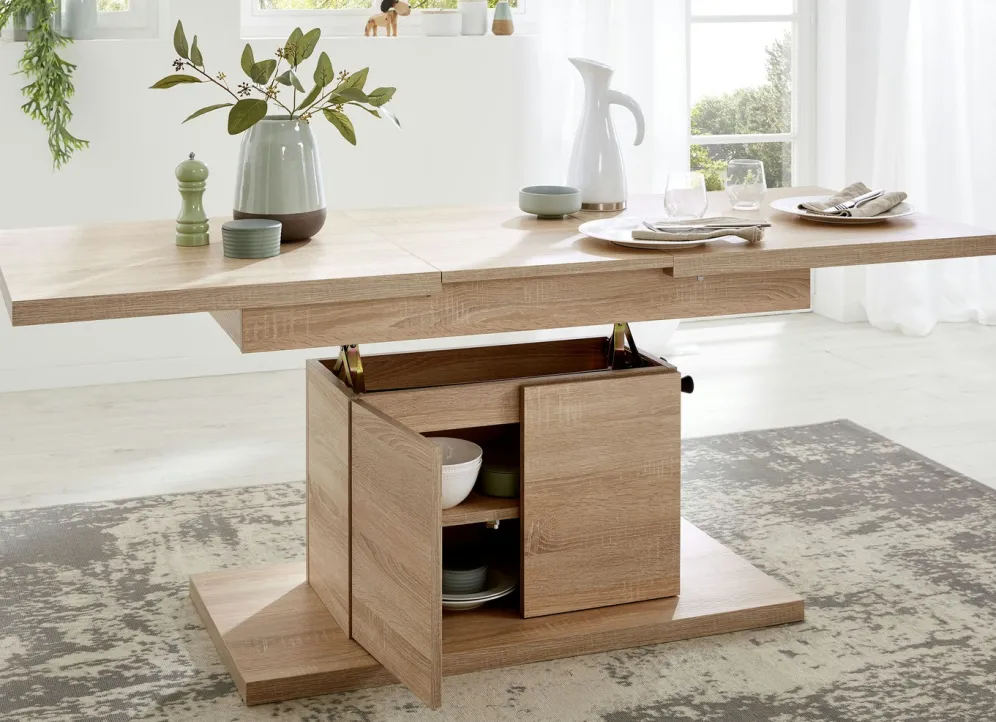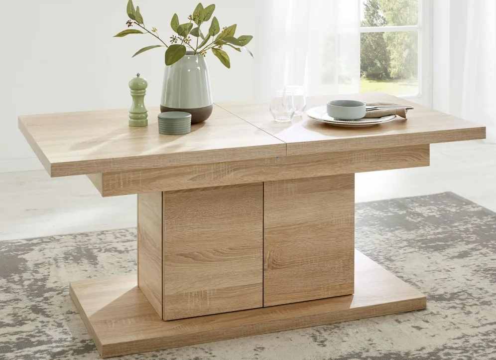 Moderner und super zu kombinierender Couchtisch. Der Tisch ist kratzfest, leicht zu reinigen und besonders geschützt gegen Verblassen. Mit praktischer Höhenverstellung, Auszieh-Mechanismus mit 40 cm breiter Einlage und Sockel mit 2 Türen mit Push-Up- System, dahinter 1 Einlegeboden.