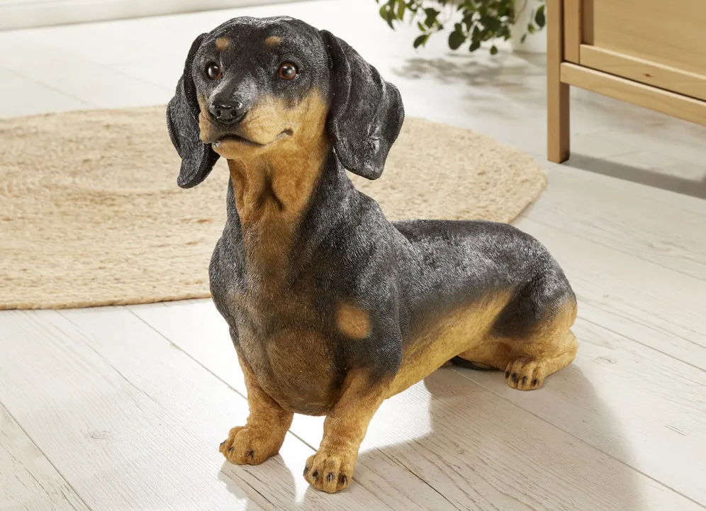 Dackel aus hochwertigem Polyresin in Schwarz-Braun.