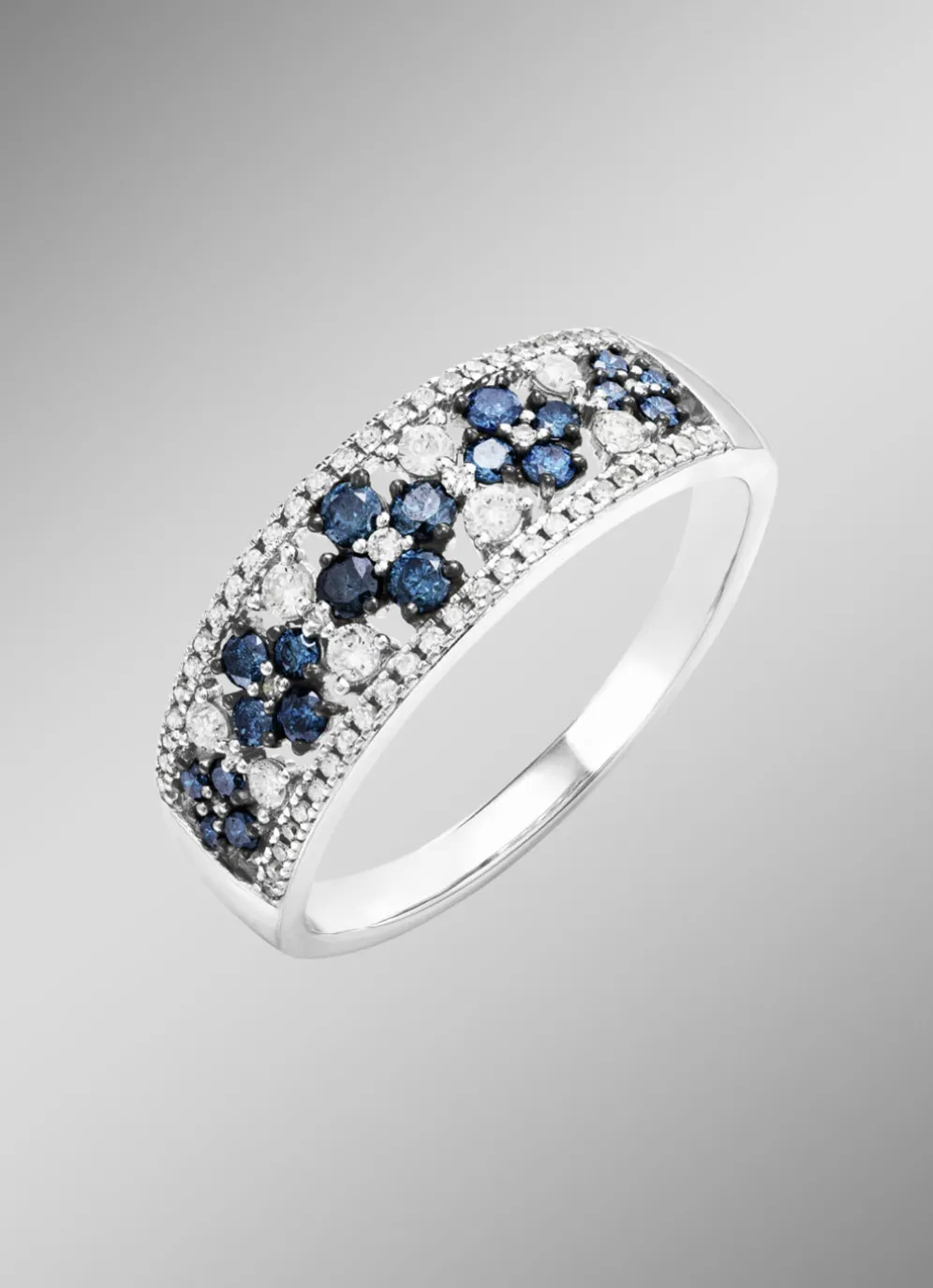 aus edlem 585er Weißgold vereint schimmernde Weißdiamanten mit einem Hauch von Farbe. 38 weiße Diamanten, 8 brillante weiße Steine und 20 leuchtend blaue Brillanten (zus. ca. 0,75 ct., Piqué 1) setzen funkelnde Akzente, die das Design perfekt abrunden. Mit einer Ringkopfbreite von 8 mm strahlt dieses Schmuckstück pure Klasse aus und unterstreicht Ihre individuelle Schönheit.