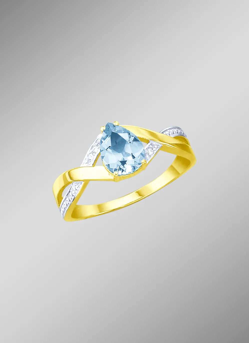 Der 8 mm breite Ringkopf in Tropfenform ist mit einem echten Blautopas, beh., und 3 Brillanten, Weiß, Piqué 2, versehen und überzeugt durch seine schimmernden Facetten und sein unendliches Strahlen.