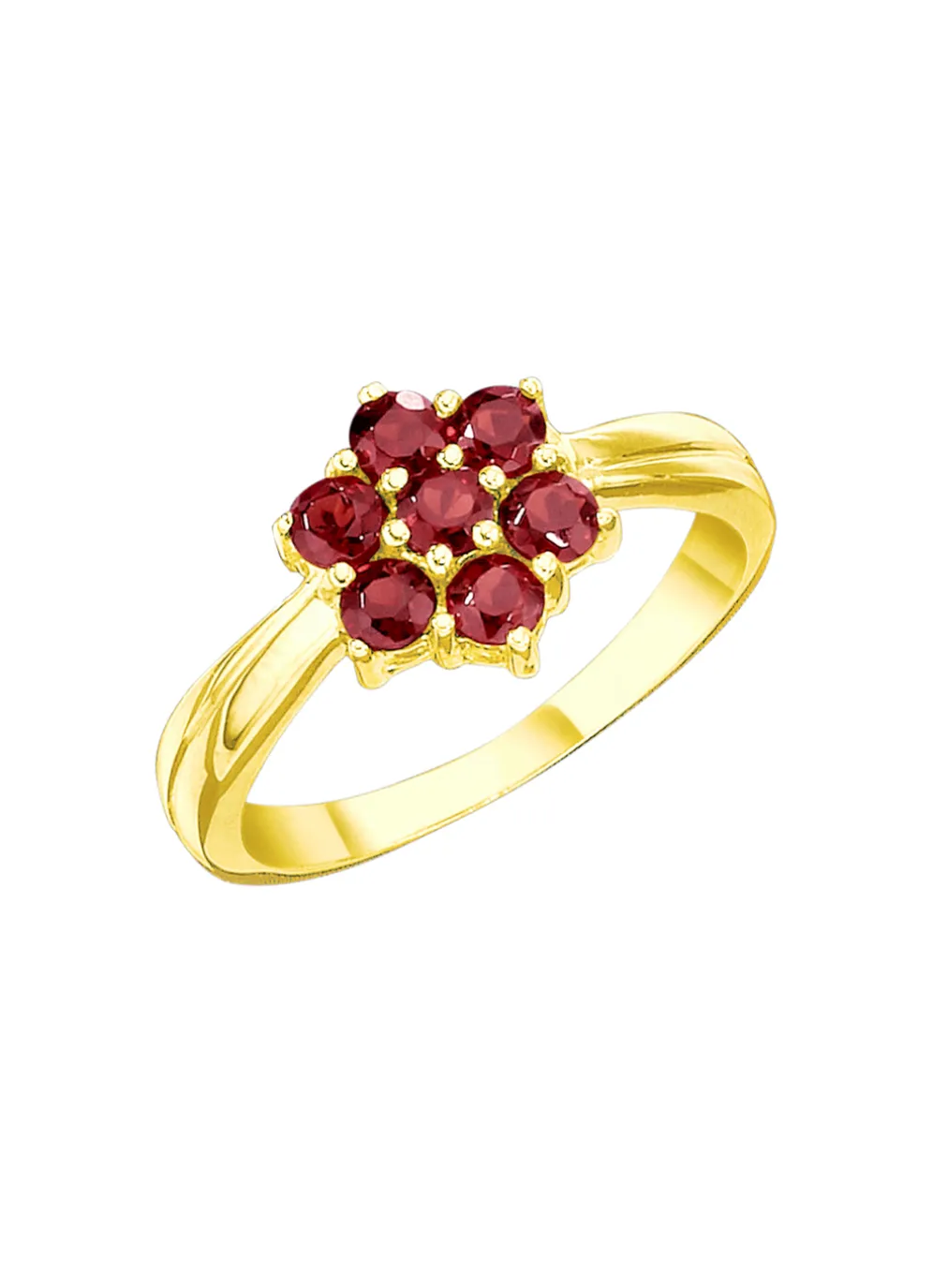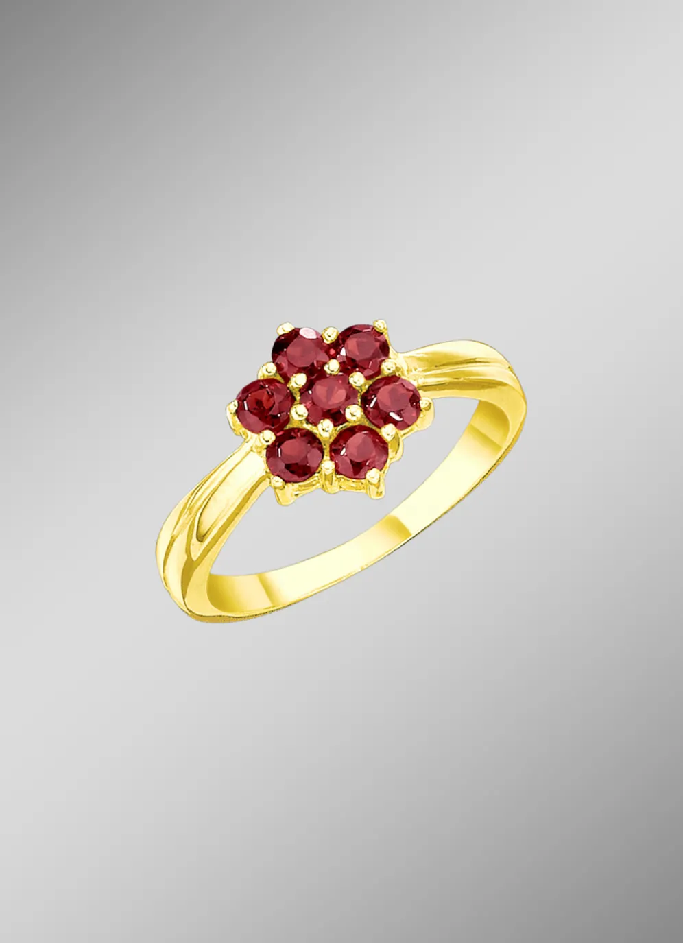 7 echte Granat-Steine in wunderschönem klaren Rot sind das Highlight dieses Damenrings. Die Edelsteine, perfekt in Blütenform gefasst, strahlen auf dem 10 mm breiten Ringkopf.