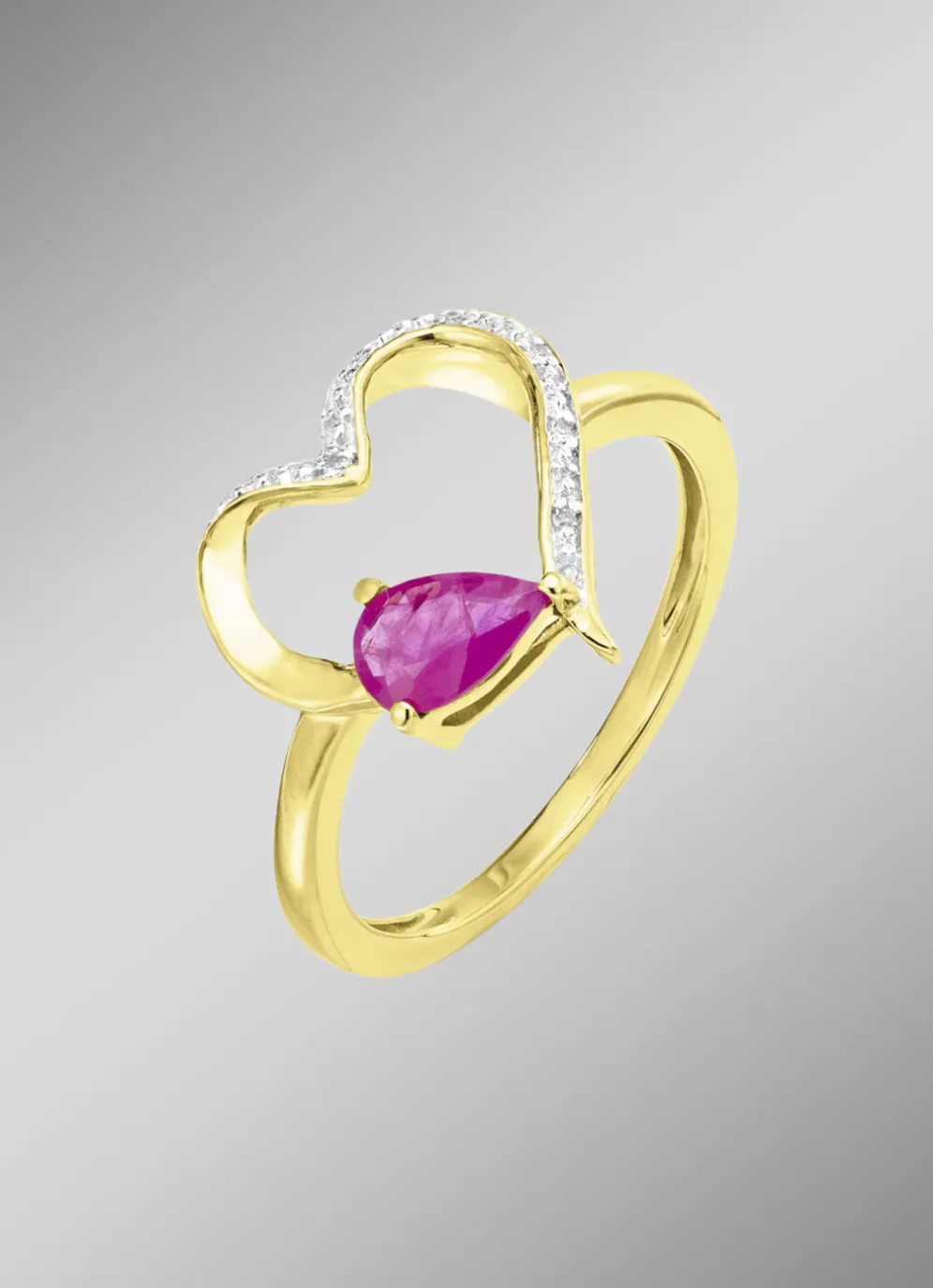 Damenring mit echt Rubin im herzförmigen Ringkopf in der Legierung Gold 375/- fein und in Größe 180.