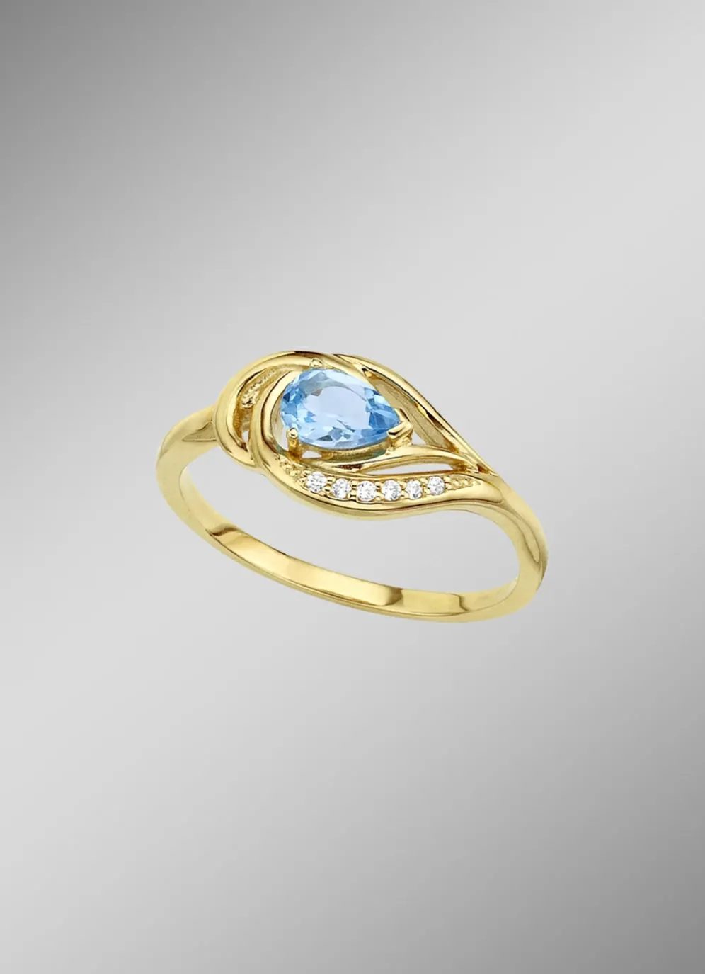 Dieser zauberhafte Damenring ist in Gold 585/- fein oder Gold 375/- fein erhältlich. Der 8 mm breite Ringkopf trägt einen leuchtenden, beh. Blautopas in Tropfenform, welcher durch seine schimmernden Facetten und sein unendliches Strahlen überzeugt. An der geschwungene Ringschiene glitzern synth. Zirkonia.