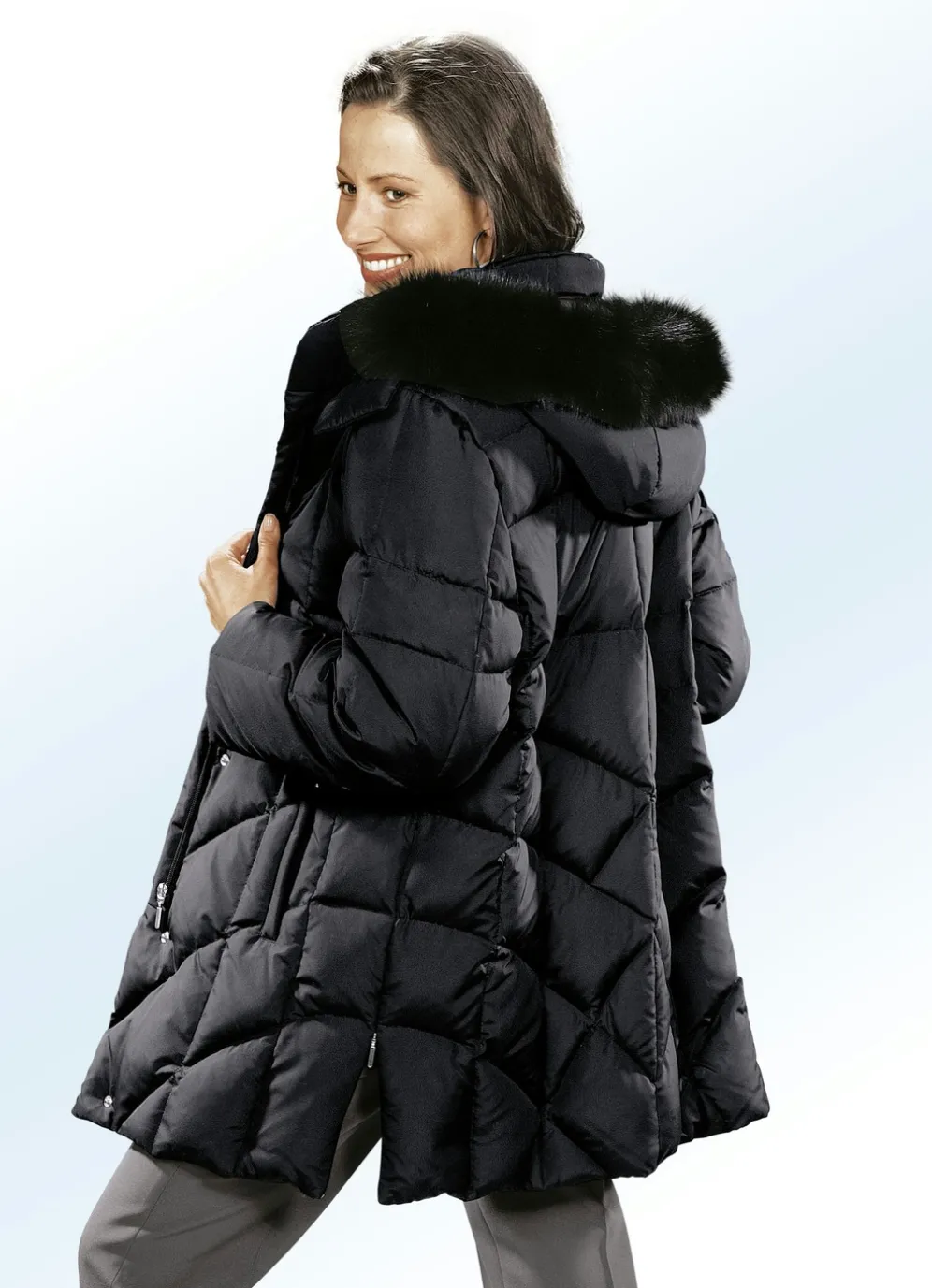 Attraktive, antaillierte Daunenjacke in Schwarz: Stehkragen, abnehmbarer Kunstpelz-Besatz an der abnehmbaren Kapuze, Reißverschluss unter der verdeckten Druckerleiste, Taschen mit Reißverschluss und Blende, umschlagbare Ärmel, eine Innentasche und eine Handy-Innentasche. Länge ca. 84 cm.