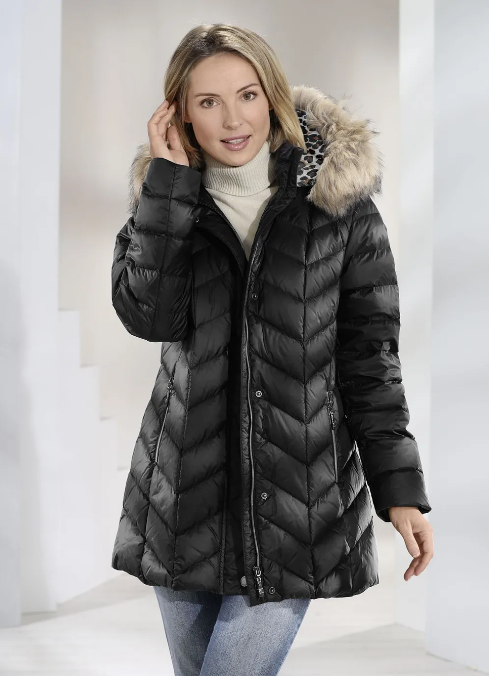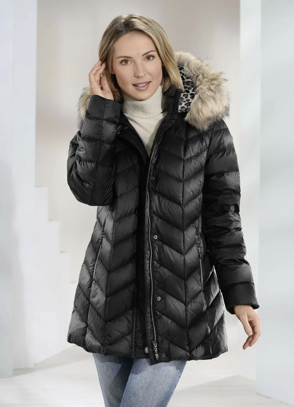 Große Klasse ist diese schwarze Daunenjacke: abnehmbare Kapuze mit Durchzugsband und Stopper sowie abnehmbarem Kunstpelz-Besatz, durch 2-Wege-Reißverschluss unter der Druckerleiste hoch schließbarer Stehkragen, Reißverschlusstaschen, Ärmelabschlüsse mit Windfang aus Rippenstrick sowie eine Innentasche. Länge ca. 80 cm, ab Gr. 46 ca. 82 cm.