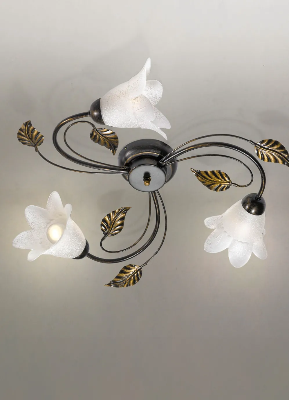 Klassisch schöne und detailverliebt verarbeitete Deckenleuchte aus braun-schwarz-goldfarbenem Metall mit dekorativem Blattwerk und satinierten blütenförmigen Glasschirmen gefertigt. Sie spenden stimmungsvolles Licht auch in den dunkelsten Räumen. 230 Volt. Die Lieferung erfolgt ohne Leuchtmittel. Mit Aufbau-Anleitung