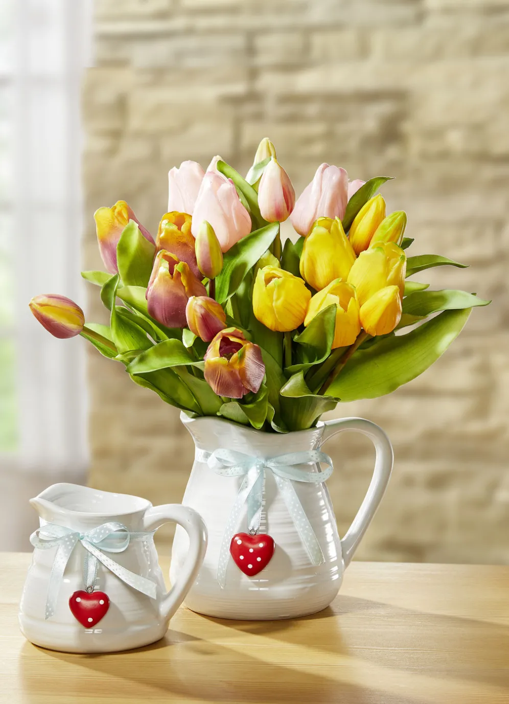 Diese schönen Deko-Krüge wurden aus Keramik gefertigt und mit bezaubernden, weißen Schleifen mit Herzanhänger aus Polyresin stilvoll dekoriert. Ob als reine Deko-Objekte oder mit Blumen bestückt sind sie ein Hingucker. Lieferung ohne Pflanzendeko.