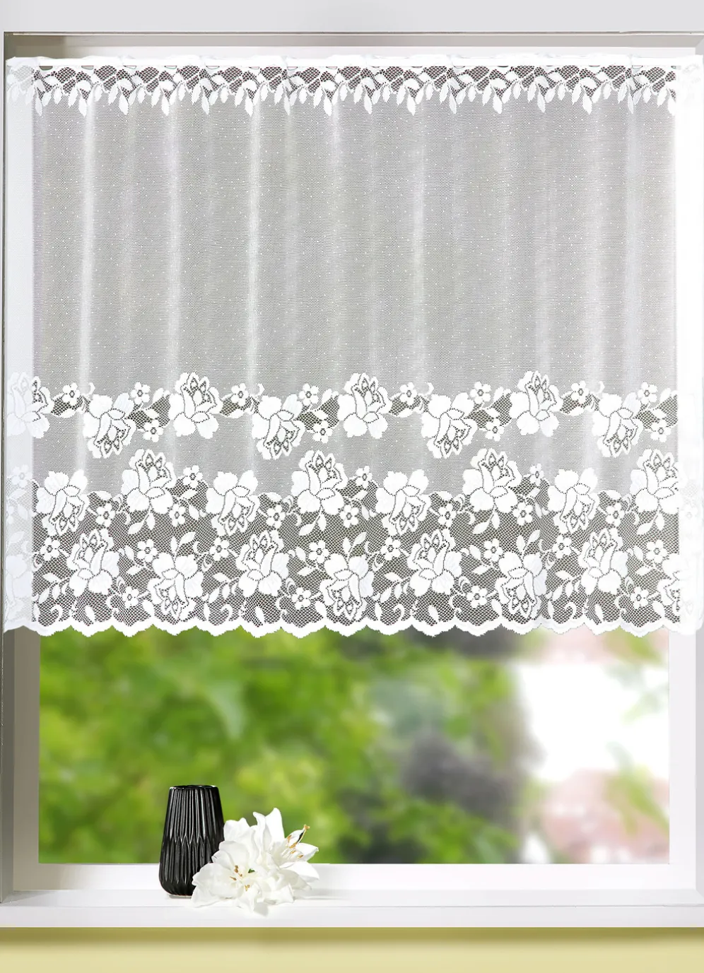 Mit einem wunderschönen, ausdrucksstarken Blüten-Dessin präsentiert sich dieser dekorative Kleinfenster-Store, der durch den gebogten Abschluss perfekt abgerundet wird. Mit Stangendurchzug.