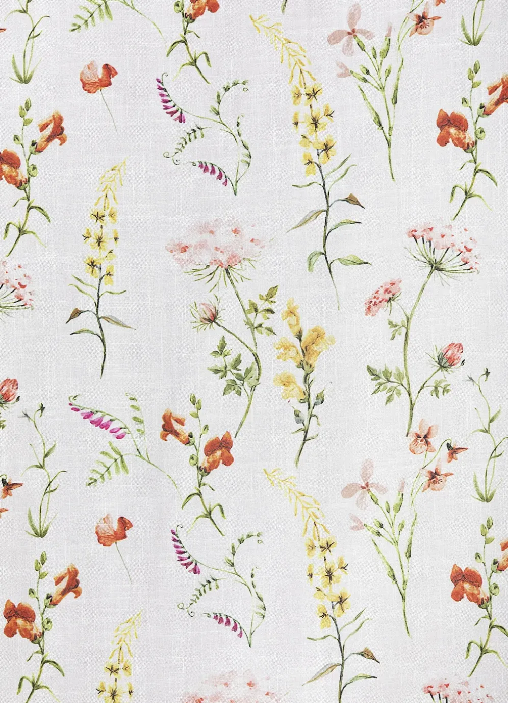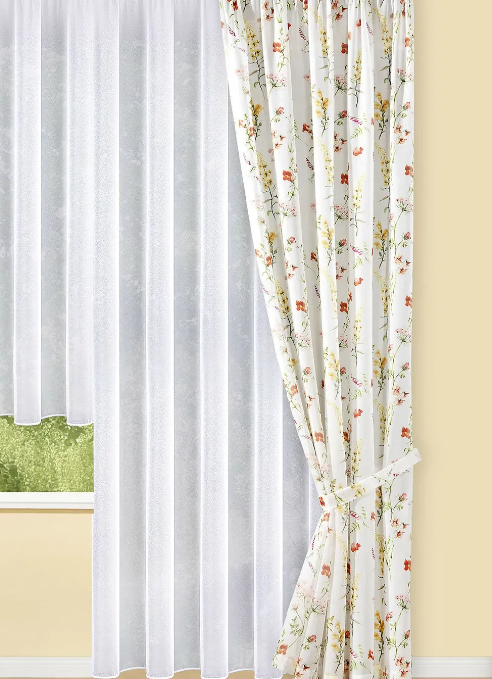 Halbtransparente Übergardine aus bedrucktem Käseleinen. Mit Frühlingsblumen-Motiv sowie Universalschienenband.