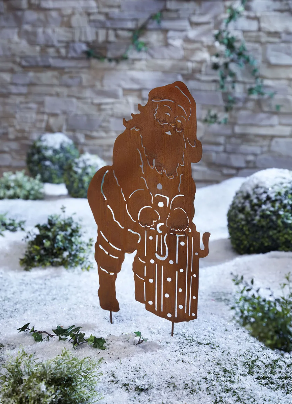 In angesagter Rost-Optik gefertigter Gartenstecker in Form einer Weihnachtsmann-Silhouette. So können Sie zur Advents- und Weihnachtszeit Ihren Außenbereich festlich und gleichzeitig modern gestalten. Maße: B35xH80cm.