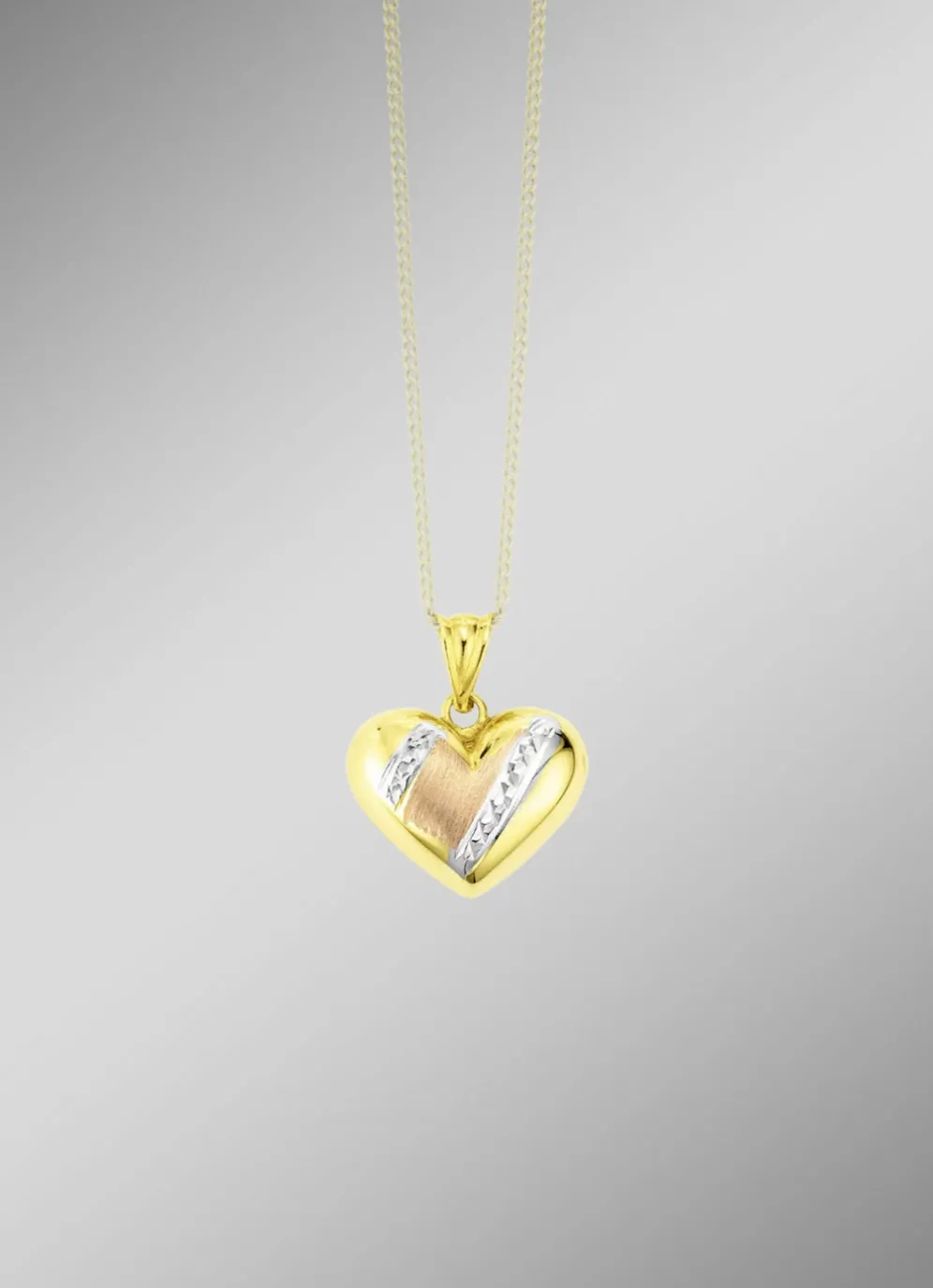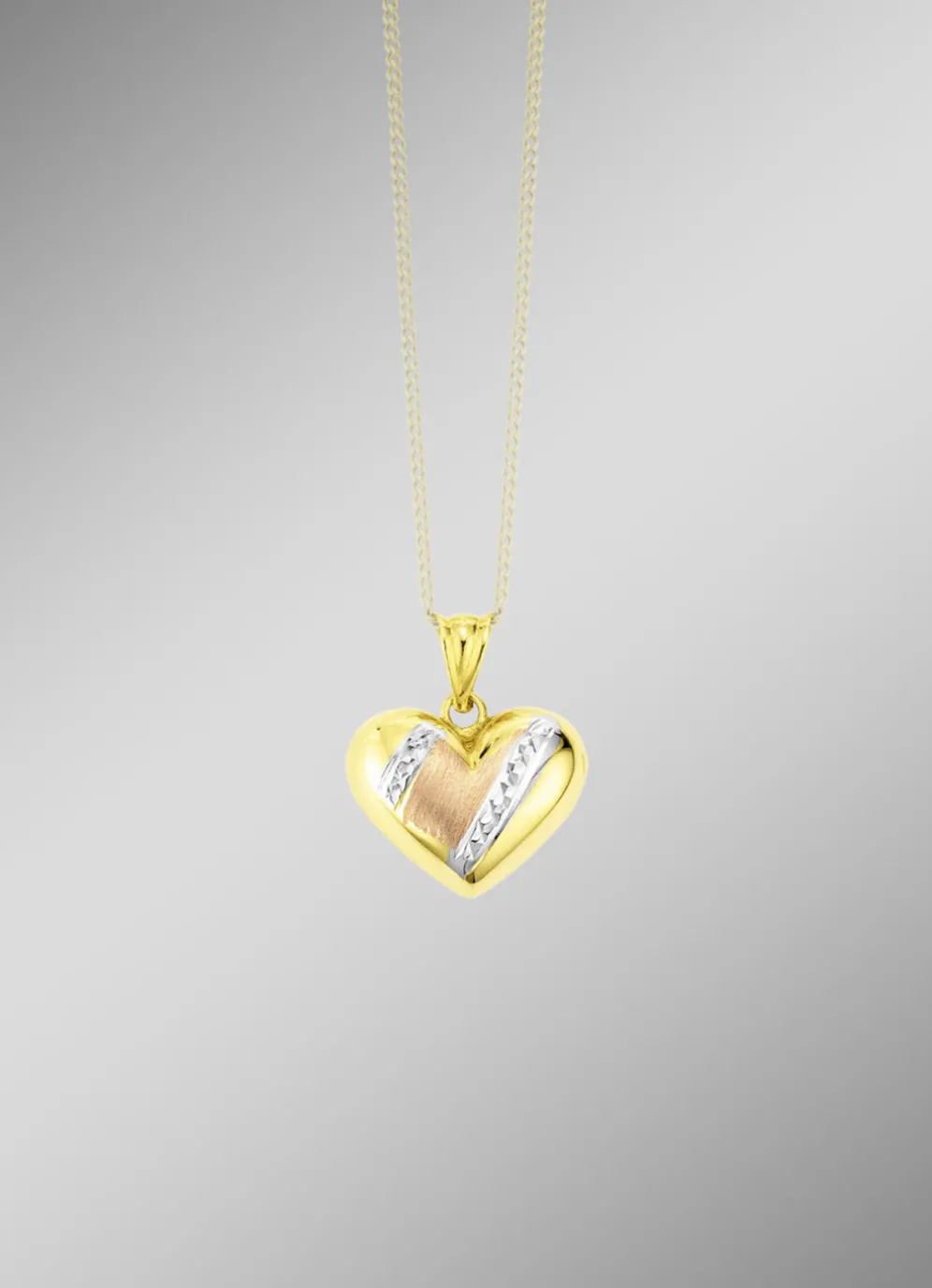 Romantik pur! In wundervollem Tricolor-Design zeigt sich dieser „Herz”-Anhänger aus feinem Gold 585/- fein. Die Verbindung aus diamantiertem Rhodium, glänzendem Gelbgold und satiniertem Roségold bietet einen interessanten Kontrast und verleiht dem Anhänger einen besonderen Glanz.
