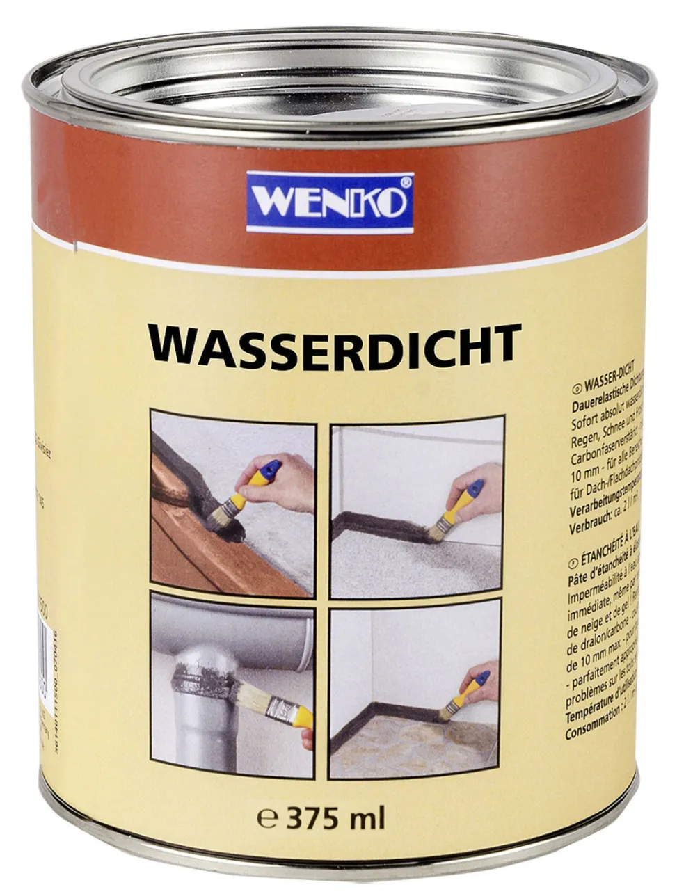 Kinderleicht, streich- und spachtelbar und einfach mit Pinsel oder Spachtel aufzutragen. „Wasserdicht“ dichtet Dachpappe, Schweißbahnen, Faserzement-Baustoffen, Teer, Aluminium, Kupfer, Zink, Blei, Schiefer, Schindeln, Kunststoff, PVC, Acryl, Polyäthylen, Teichfolie, Guss und Holz innen und außen. UV-beständig, silikonverträglich, Bitumen-, teer-, und asbestfrei. Rissüberbrückend bis zu 10 mm. Inhalt je Dose 375ml