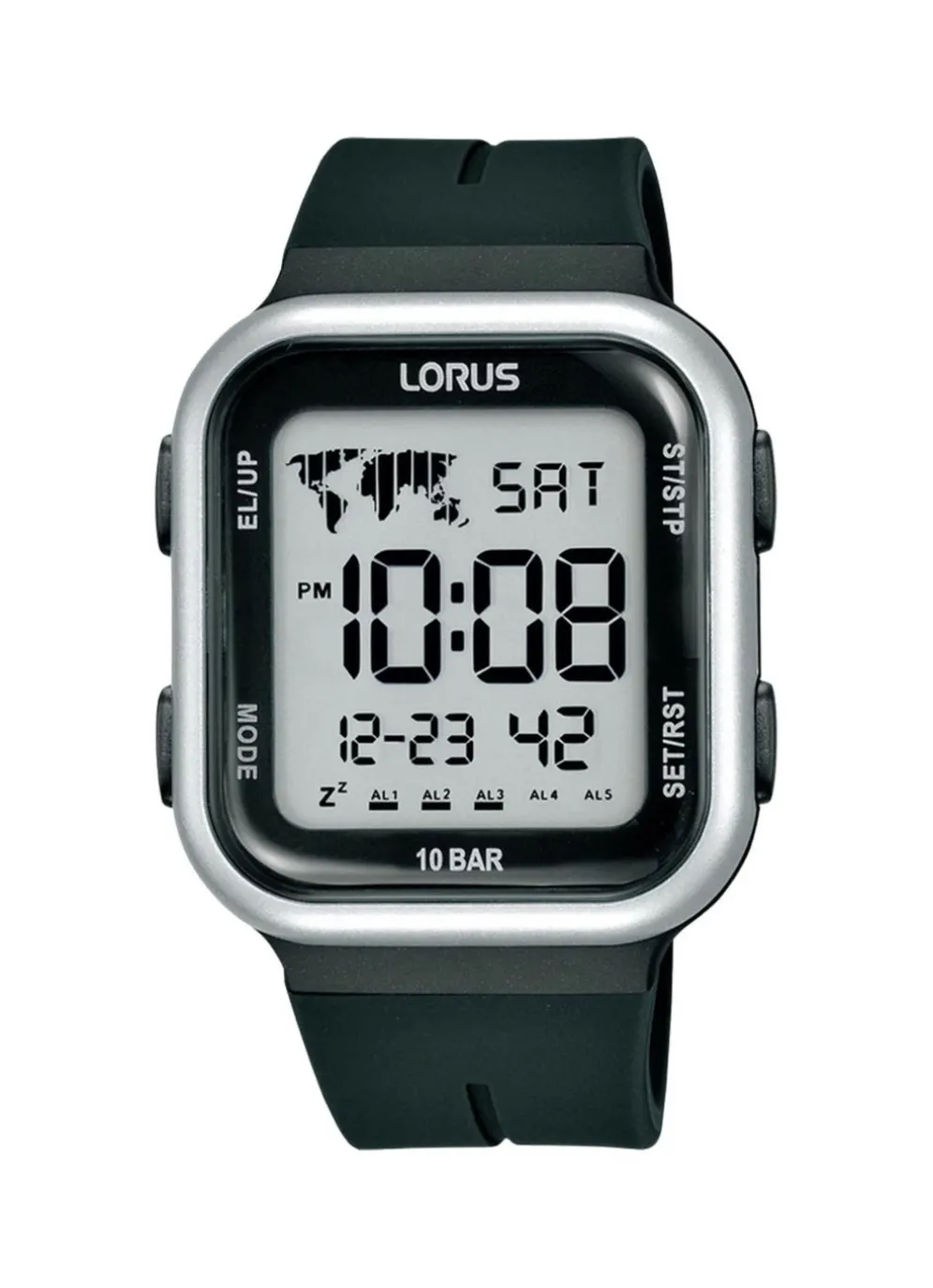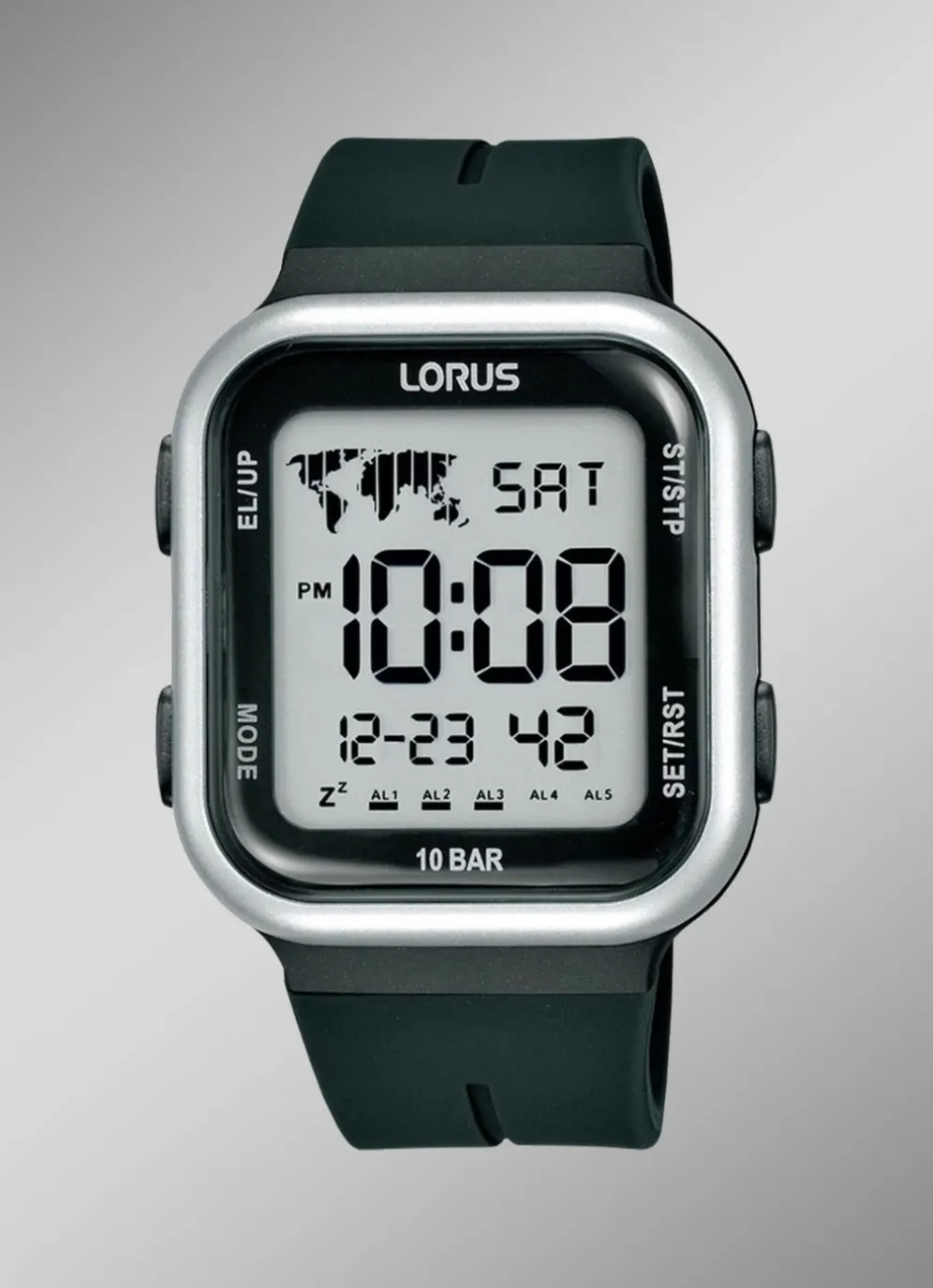 Sportliche Digital-Herrenuhr der Marke Lorus. Die Herrenuhr hat ein Kunststoffgehäuse, ein Silikonband mit Dornschliesse und Acrylglas. Zudem gibt es einen automatischen Kalender, einen Multifunktionsalarm, eine 12/24h-Anzeige und eine Stoppuhr. Die Herrenuhr ist 10 bar wasserdicht und hat eine Gehäusegröße von 38 x 38 mm.