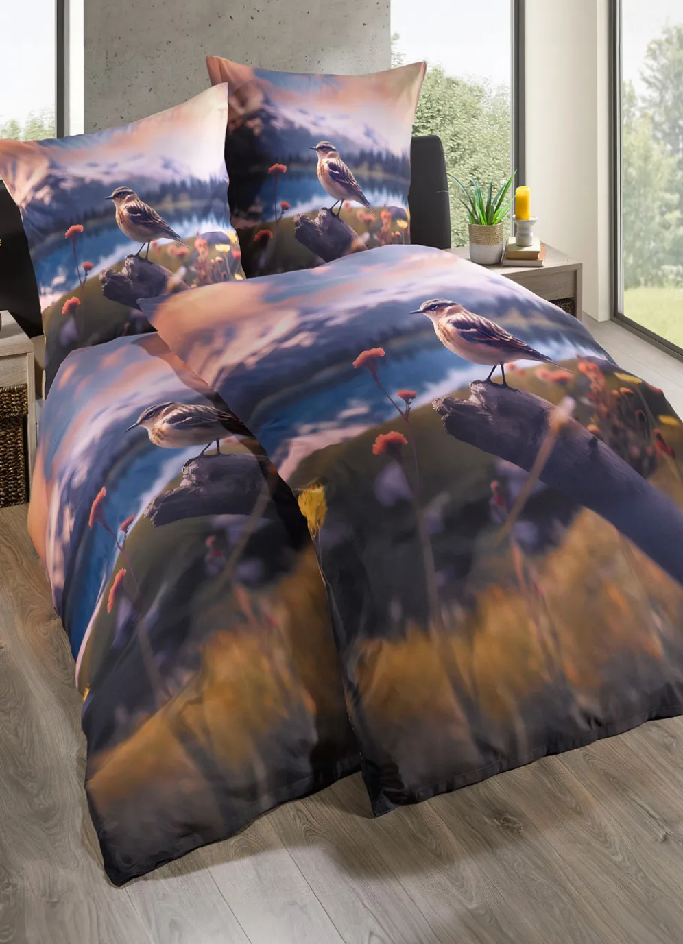 Auf der Vorderseite dieser digitalbedruckten Bettwäsche-Garnitur zeigt sich ein Braunkehlchen, der „Vogel des Jahres 2023“, in einer wunderschönen Szenerie einer malerischen Naturlandschaft. Rückseite uni. Mit praktischem Reißverschluss.