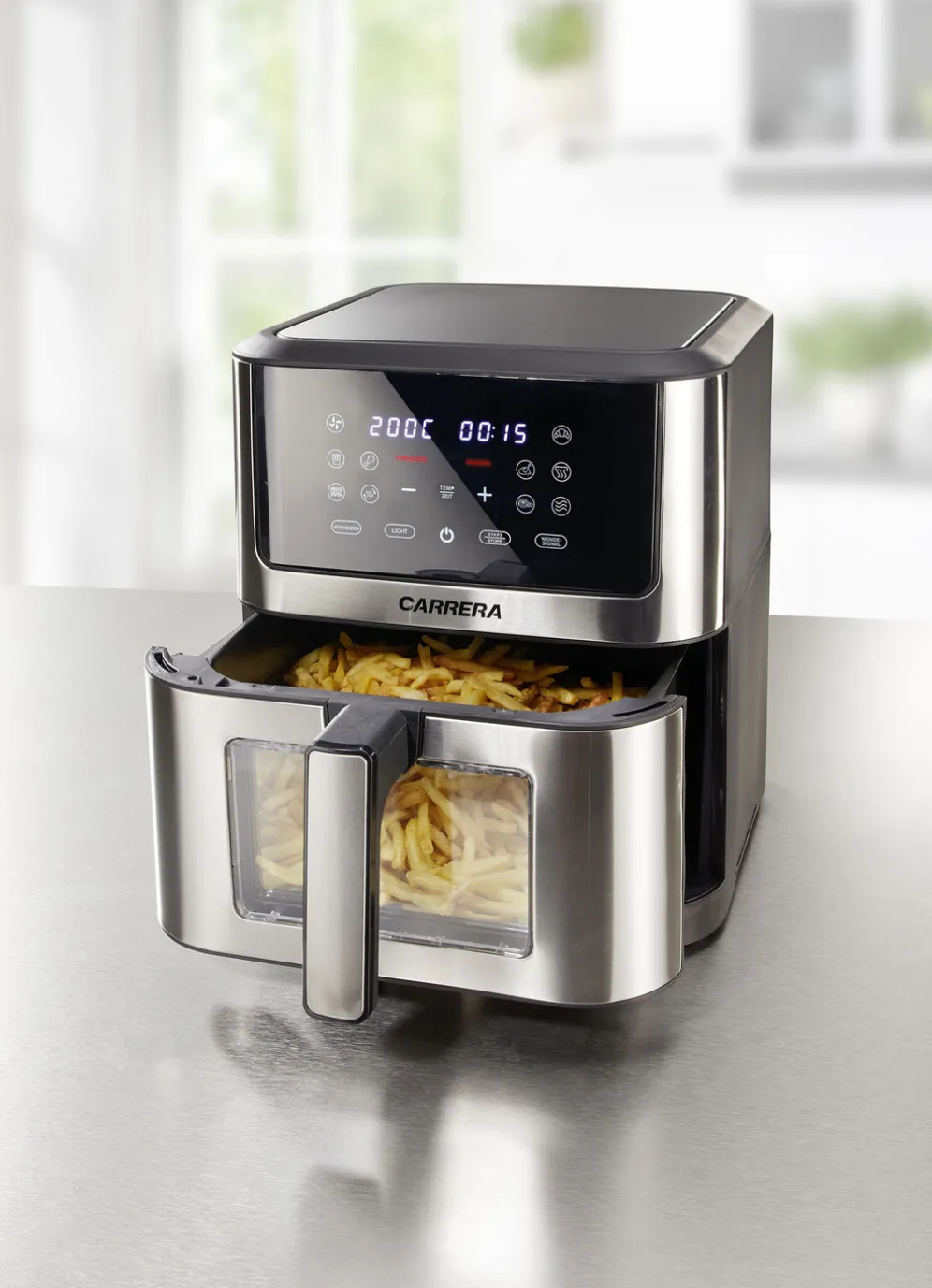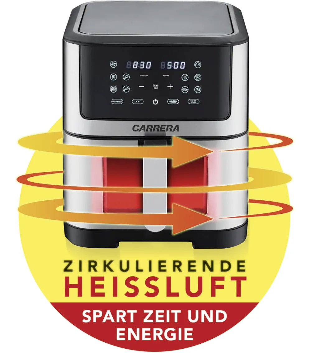 „Carrera“ Heißluft-Fritteuse – zum Frittieren, Grillen, Braten, Backen, Erhitzen und Warmhalten. Für knusprige, goldbraune Pommes frites ganz ohne zusätzliches Öl. Bereiten Sie kulinarische Snacks, saftiges Fleisch, Hähnchen oder Tapas auf schnelle und gesunde Art zu. Die clevere Kombination aus schnell zirkulierender, heißer Luft und einem Gitterblech spart Zeit und Energie. Es entstehen weniger Gerüche. mit großem Sichtfenster aus Glas zum Überwachen des Kochvorgangs.