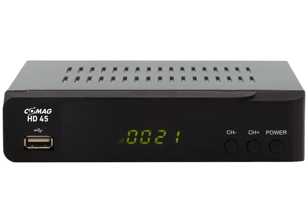„Comag“ HD 45 SAT. Digitaler HD-Satelliten-Receiver für frei empfangbare TV- und Radioprogramme in bester HD-Qualität. Einfach zu bedienen. Programmvorschau bis zu sieben Tage (senderabhängig). Automatischer Sendersuchlauf. 5000 Programmspeicherplätze, 8 Favoritenlisten und 800 Seiten Super Fast Teletext. Aufnahme von TV Sendungen und zeitversetztes Fernsehen auf USB-Speichergerät (nicht im Lieferumfang) möglich. Mit USB-Mediaplayer zum Abspielen von Video-, MP3-Musik- oder JEPG-Bilddateien. Inkl. Fernbedienung.