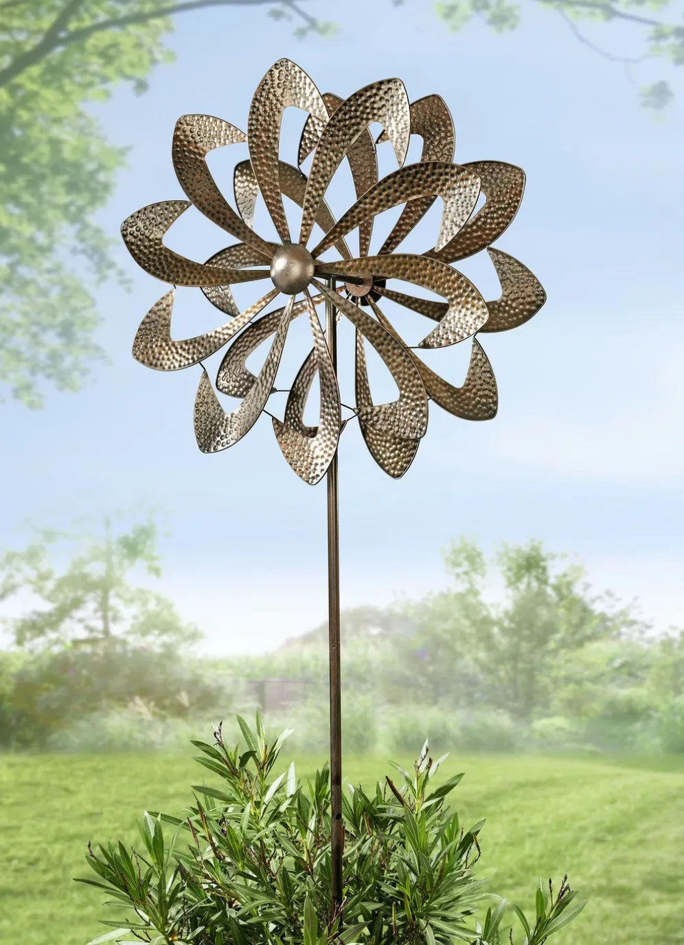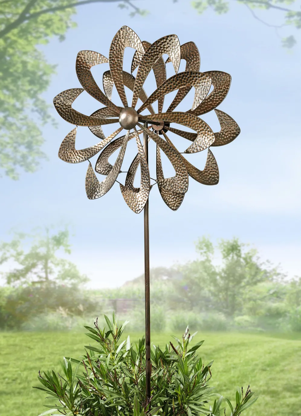 Dieses kupferfarbene, schön designte Doppel-Windrad aus Metall ist ein echter Blickfang. Durch den Erdspieß läßt sich das Windrad gut im Boden verankern. Mit Aufbau-Anleitung.