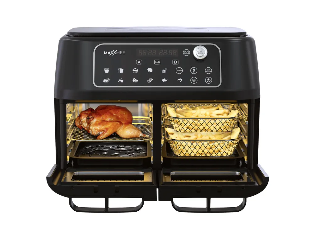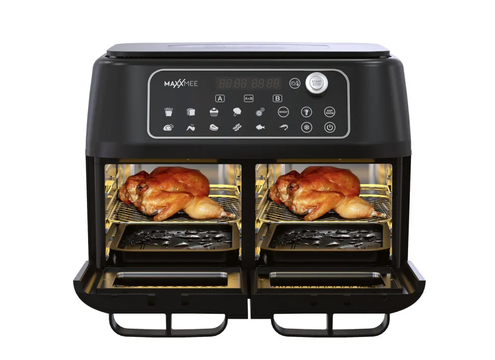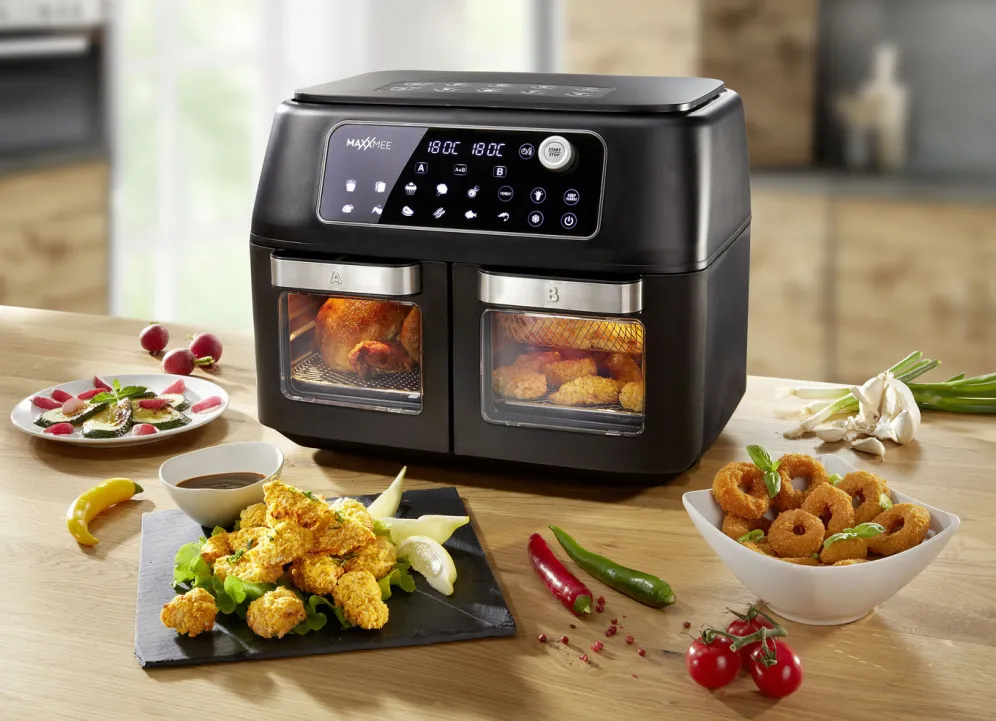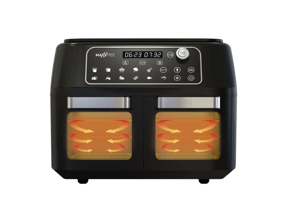 Digitale Heißluft-Doppelkammer-Fritteuse mit zwei unabhängigen Garkammern und 2 großen Sichtfenstern aus Glas – ideal zum Frittieren, Grillen, Braten, Backen, Rösten, Erhitzen, Warmhalten und Auftauen. Für knusprige, goldbraune Pommes frites ganz ohne zusätzliches Öl und ohne Vorheizen. Bereiten Sie kulinarische Snacks, saftiges Fleisch, Hähnchen oder Tapas auf schnelle und gesunde Art zu. Die clevere Kombination aus schnell zirkulierender, heißer Luft und einem Grillelement spart Zeit und Energie. Es entstehen weniger Gerüche.