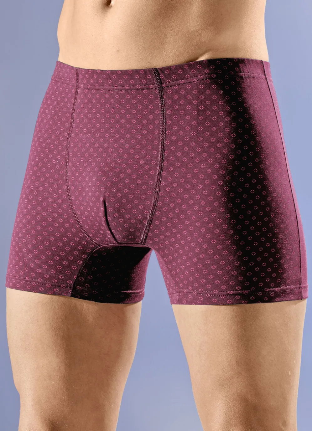 Dreierpack Pants mit Dehnbund in 2X Marine, 1X Bordeaux und in Größe 5.
