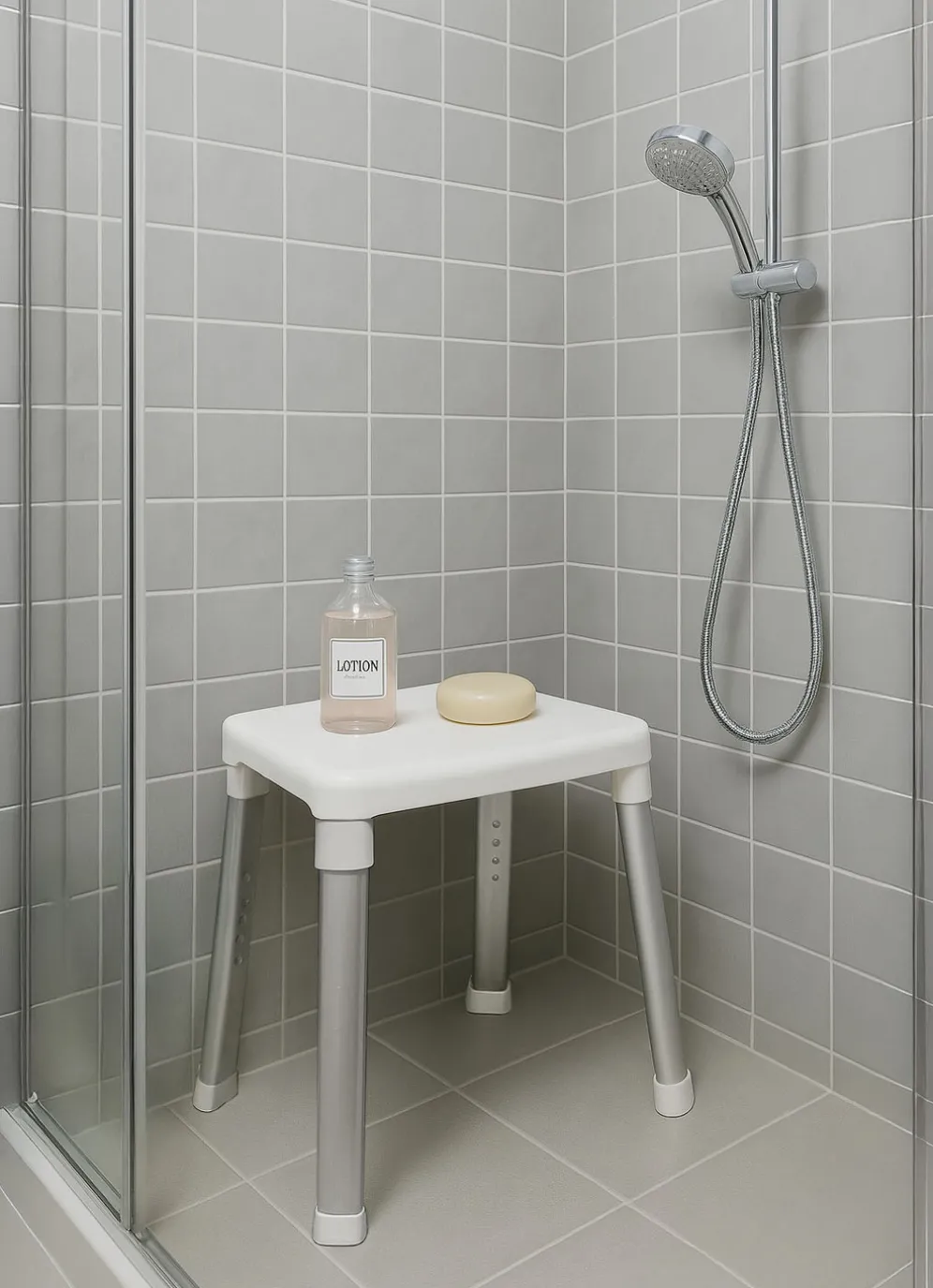 Dank der gummierten Füße ist ein Verrutschen in der Dusche ausgeschlossen. Das belastbare Aluminiumgestell ist leicht und dennoch stabil. Er trägt ein Maximalgewicht von 150 kg. Einfache Montage ohne Hilfsmittel.