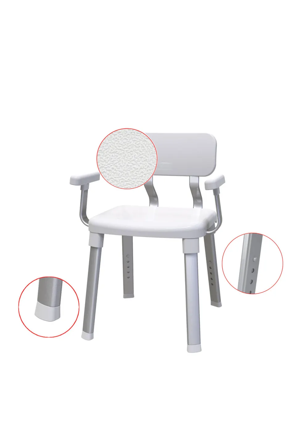 Dusch- und Badestuhl mit Rücken – und Armlehnen. Höhenverstellbare Sitzhöhe 42–51,5 cm. Mit großer ergonomischer Sitzfläche von 42×34 cm mit kantenloser Oberfläche. Die Sitzfläche ist hygienisch und körpersympatisch. Die elastischen Füße geben einen rutschfesten Stand. Die maximale Belastbarkeit beträgt 150 kg. Der Dusch- und Badestuhl besteht aus hochwertigem Kunststoff und stabilen Aluminiumrohren. Maße: ca. L42xB34xH70–80 cm