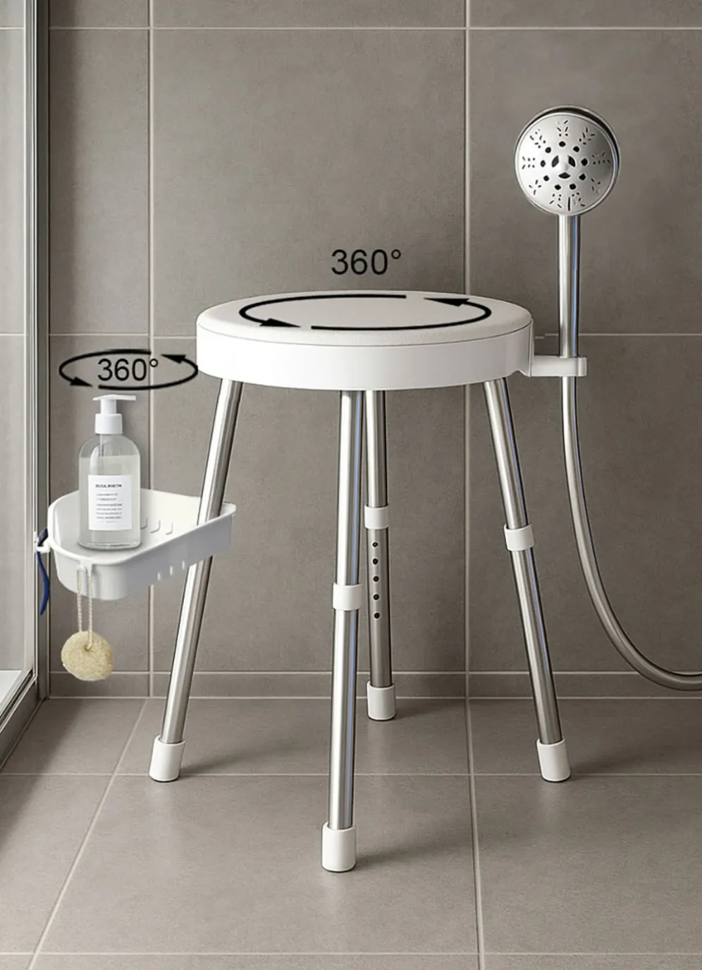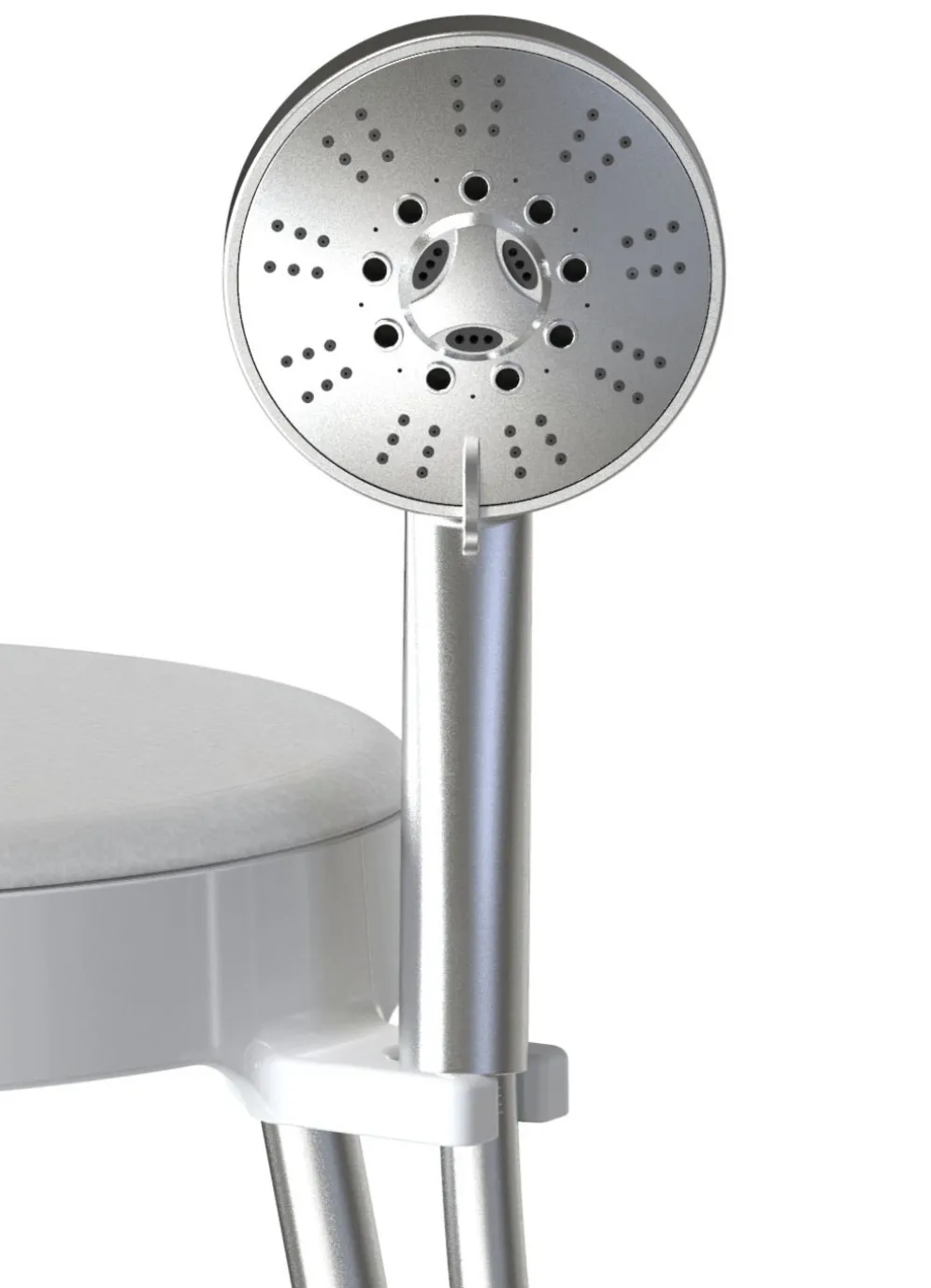 Dieser Duschhocker unterstützt bewegungseingeschränkte Personen bei der täglichen Hygiene. Mit um 360° drehbarem Sitz mit Stopp-Funktion. Große, hygienische Sitzfläche, ø 36 cm. 4-fach höhenverstellbar von 41-51 cm. Halterung für den Duschkopf. Große schwenkbare Ablageschale mit Wasserablauf, Haken für Waschlappen etc. Ablage unter dem Sitz, zum Duschen einfach herausziehen und Sie haben Ihre Utensilien griffbereit. Mit rutschfesten Gummifüßen, Belastbarkeit bis 150 kg.