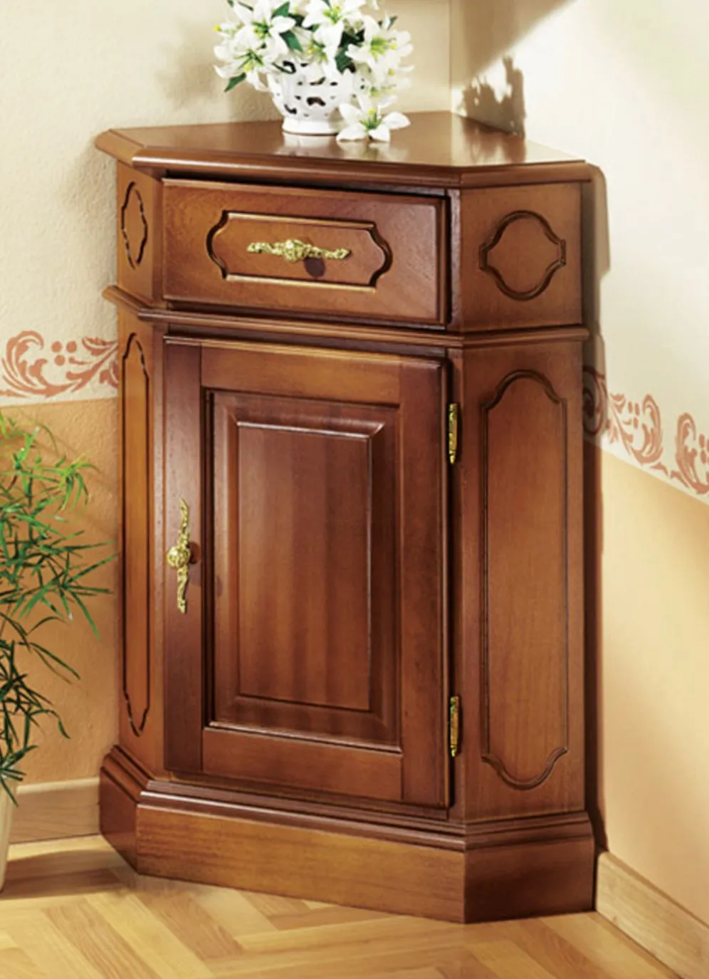 Stilvolles, teilmassive Eck-Kommode, wahlweise in Nussbaum-oder Kirschbaumdekor. Mit eleganten, goldfarbenen Metallgriffen. Die Lieferung erfolgt aufgebaut