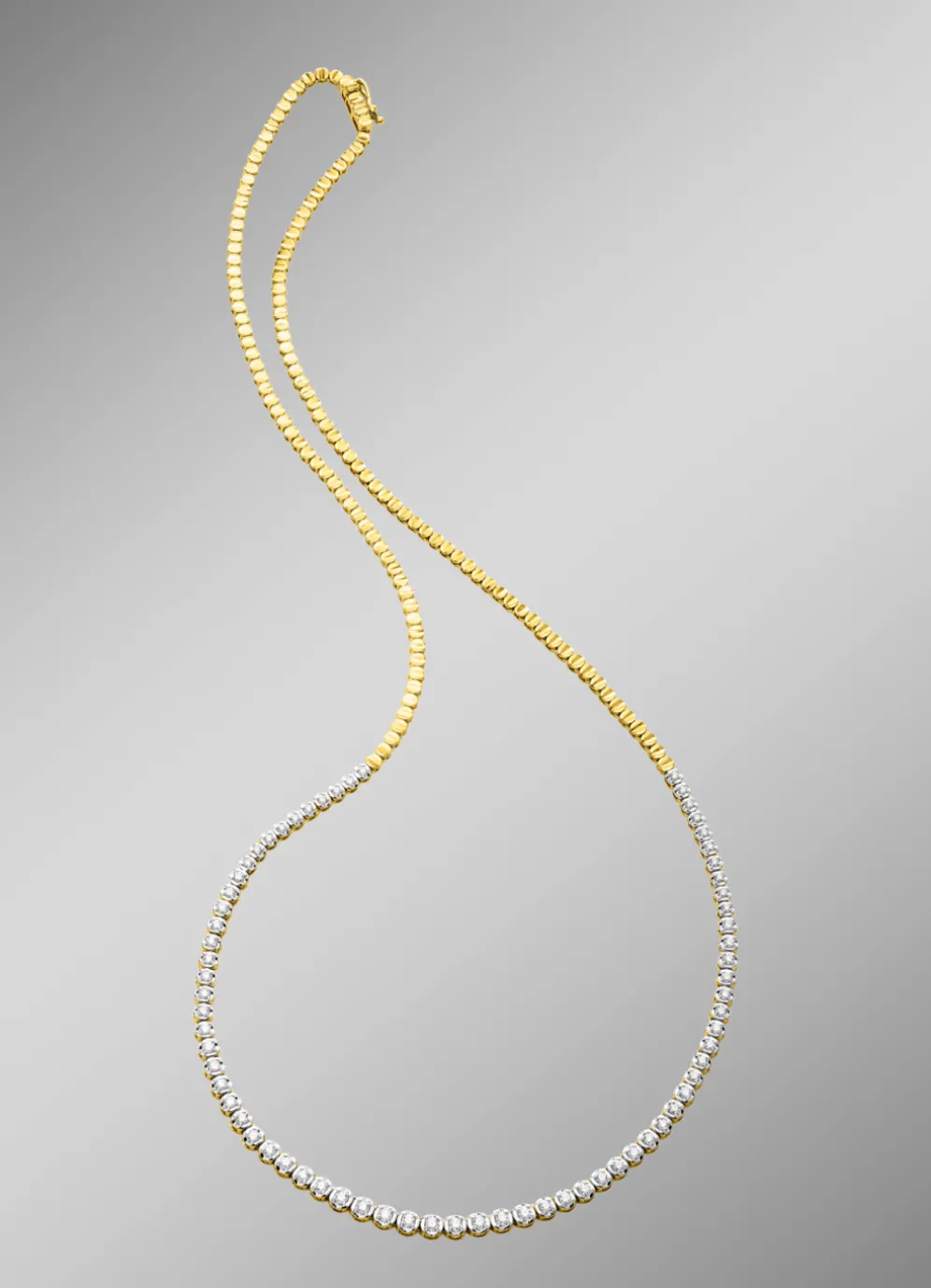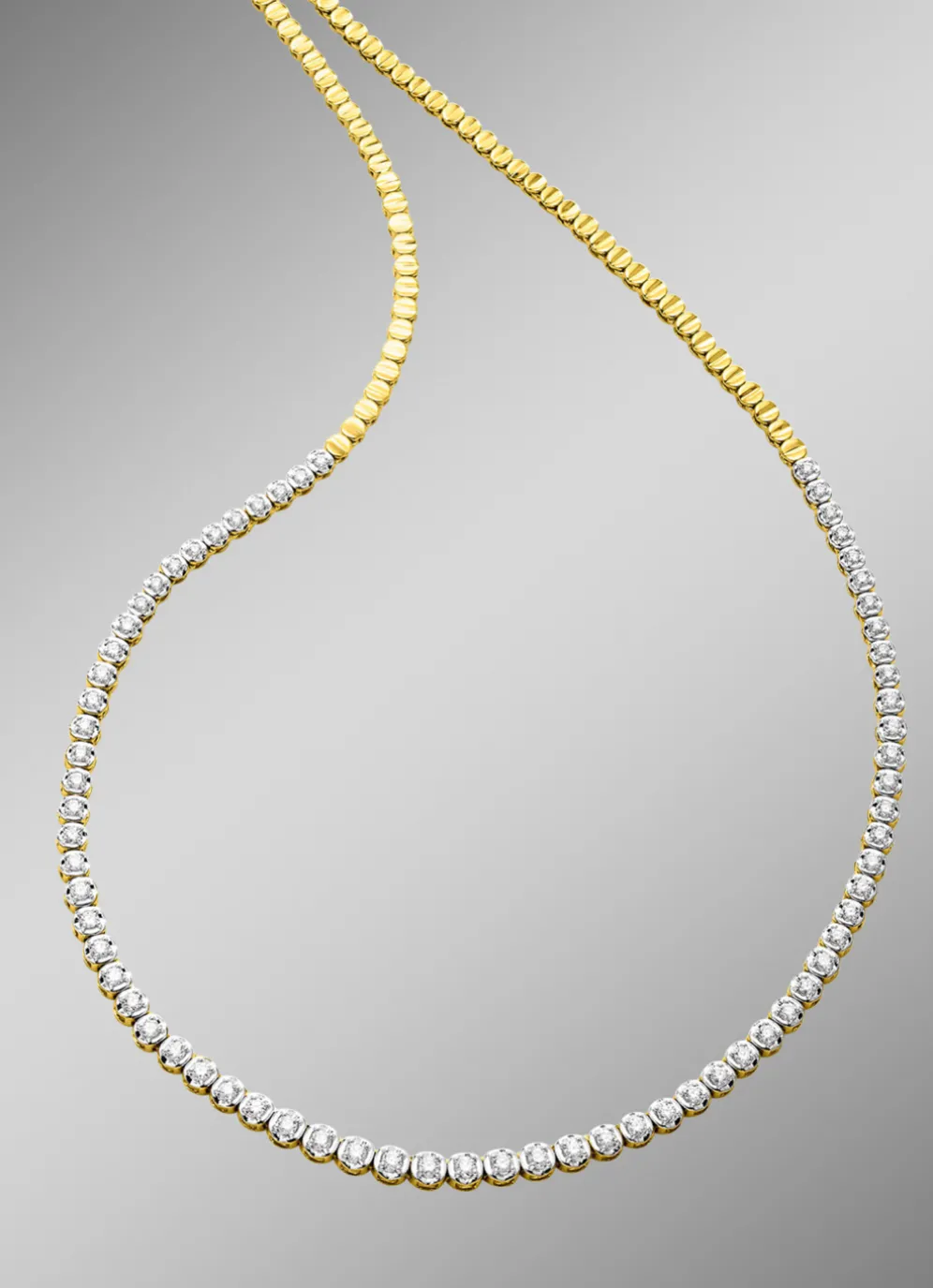 Erfreuen Sie sich an der Schönheit dieser wundervollen Halskette aus Gold 585/- fein. Das Highlight an diesem Schmuckstück sind die 69 Brillanten, ca. 1,00 ct., Weiß, SI. Dadurch präsentiert sich der 46 cm lange und 3 mm breite Halsschmuck mit zeitloser Eleganz.