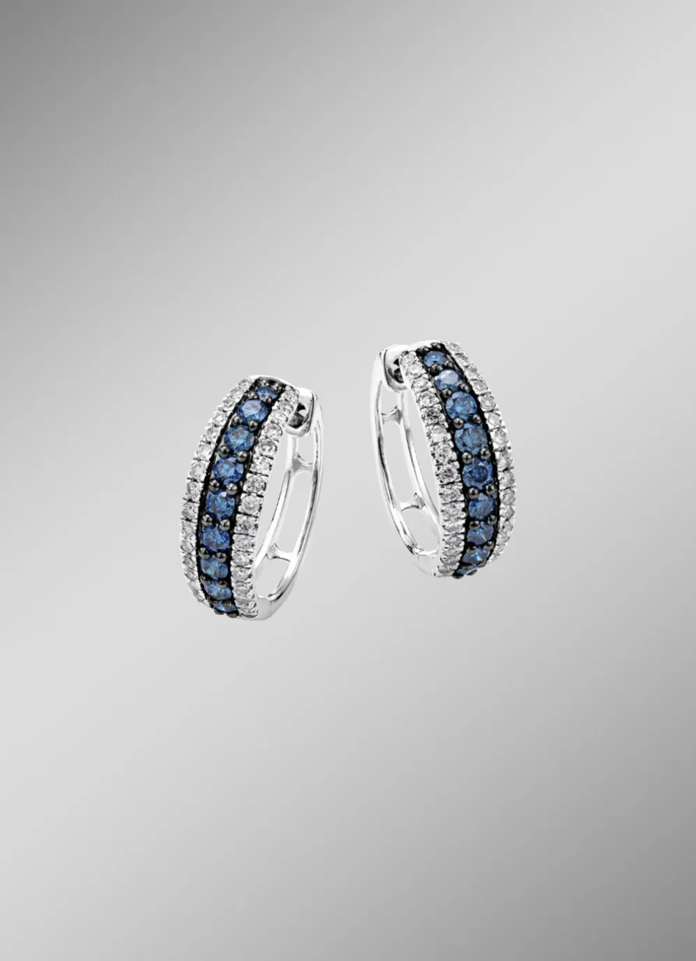 aus feinstem Weißgold 585. Diese meisterhaft gefertigten Creolen bestechen durch ihr strahlendes Funkeln: 64 weiße Diamanten und 18 leuchtend blaue Diamanten mit insgesamt ca. 0,85 ct. vereinen sich zu einer atemberaubenden Komposition aus Brillanz und Farbenspiel.