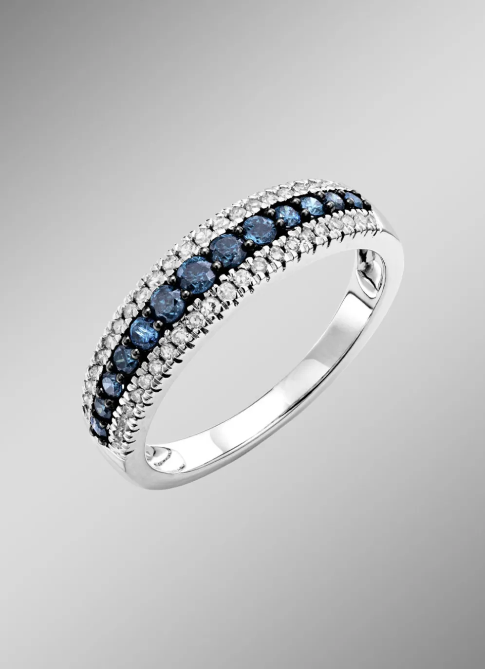 aus 585er Weißgold besticht durch seine harmonische Kombination aus Eleganz und strahlendem Glanz. 44 funkelnde weiße Diamanten und 13 leuchtend blaue Diamanten (zus. ca. 0,50 ct., Piqué 1) setzen brillante Akzente, die sich perfekt in das filigrane Design einfügen. Mit einer Ringkopfbreite von 5 mm schmiegt sich dieses Schmuckstück sanft an Ihre Hand und unterstreicht Ihre individuelle Ausstrahlung.