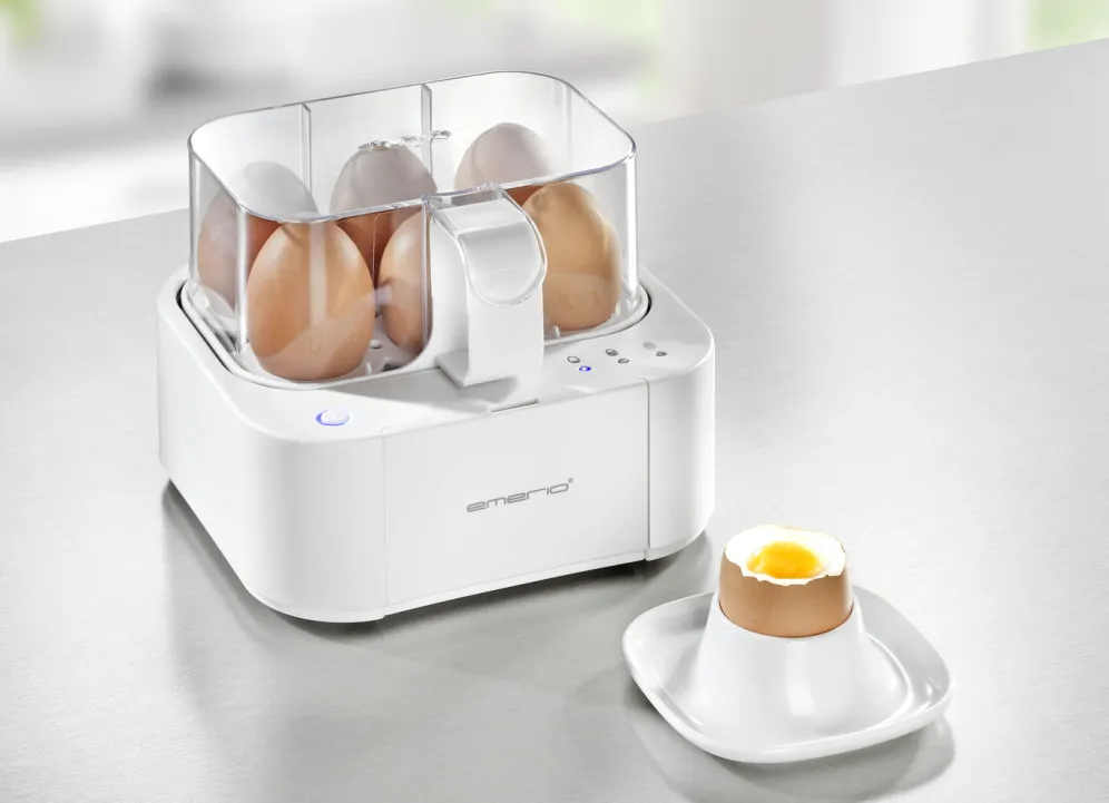 Eierkocher mit Lichtsignal und Sprachausgabe in Weiss.