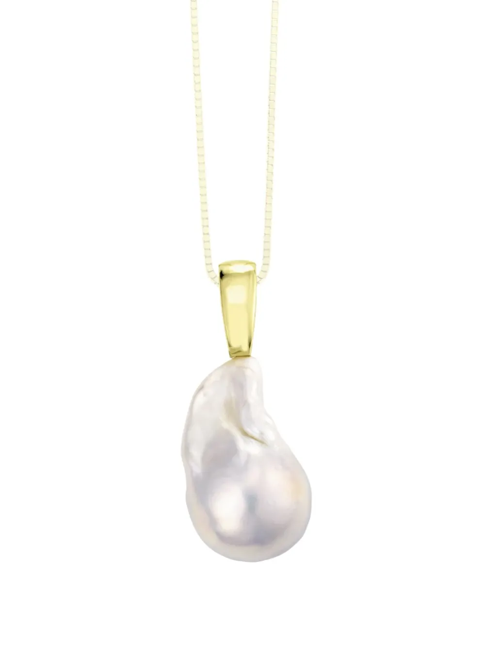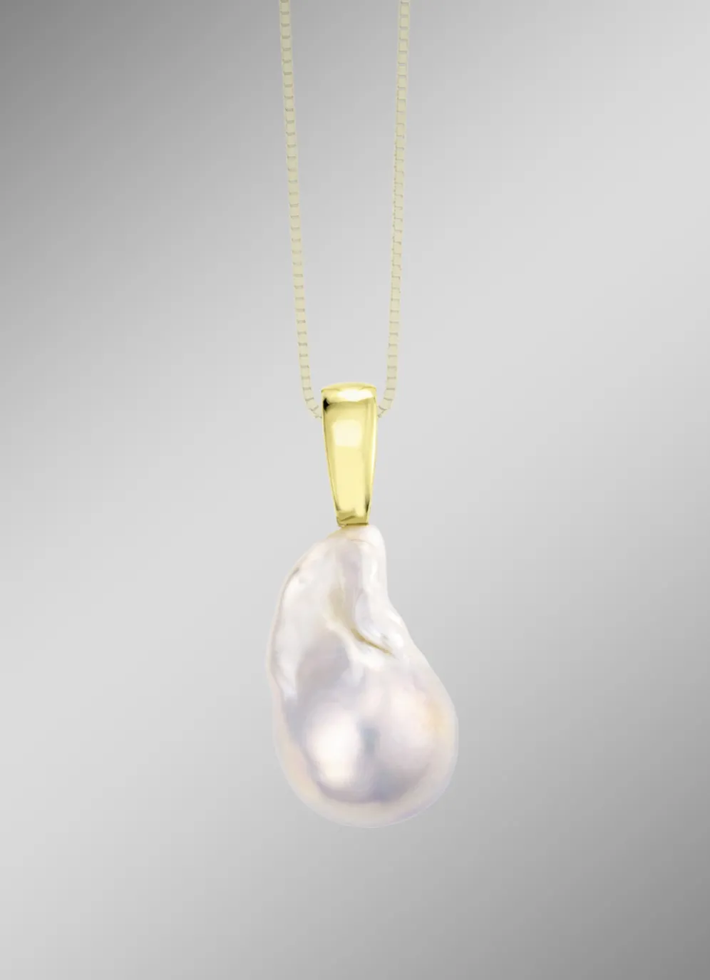 Gold 585/- fein und ist mit einer Süßwasser-Zuchtperle besetzt. Die Barock-Perle hat eine Größe von ca. 37×15 mm und ist ein individuelles Einzelstück, das es so kein zweites Mal gibt.