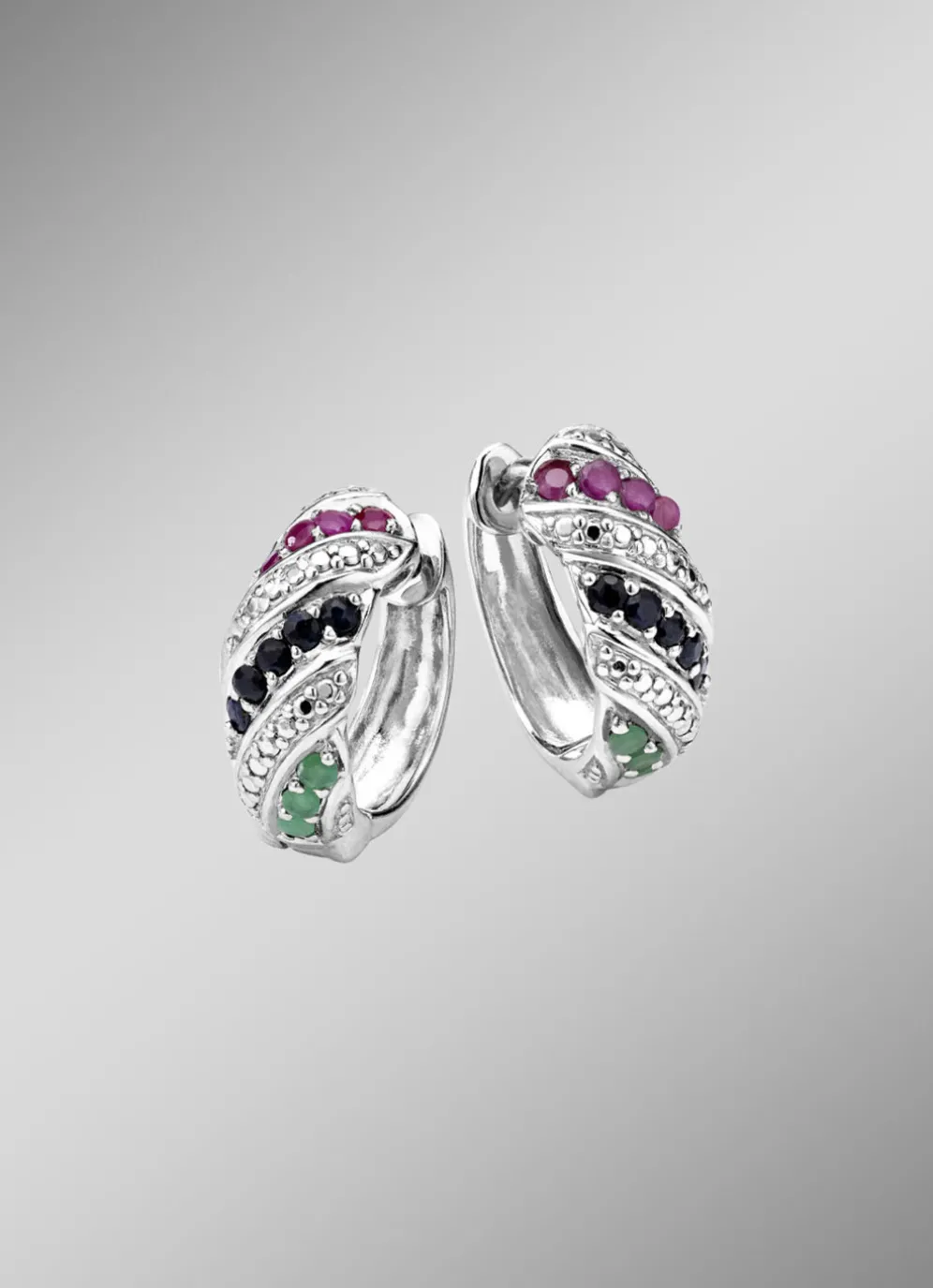 Entdecken Sie unsere exquisiten Creolen, gefertigt aus Silber 925/- fein und verziert mit echten Edelsteinen. Diese atemberaubenden Ohrringe sind mit funkelnden Rubinen, Saphiren und Smaragden besetzt und messen 20×7 mm.