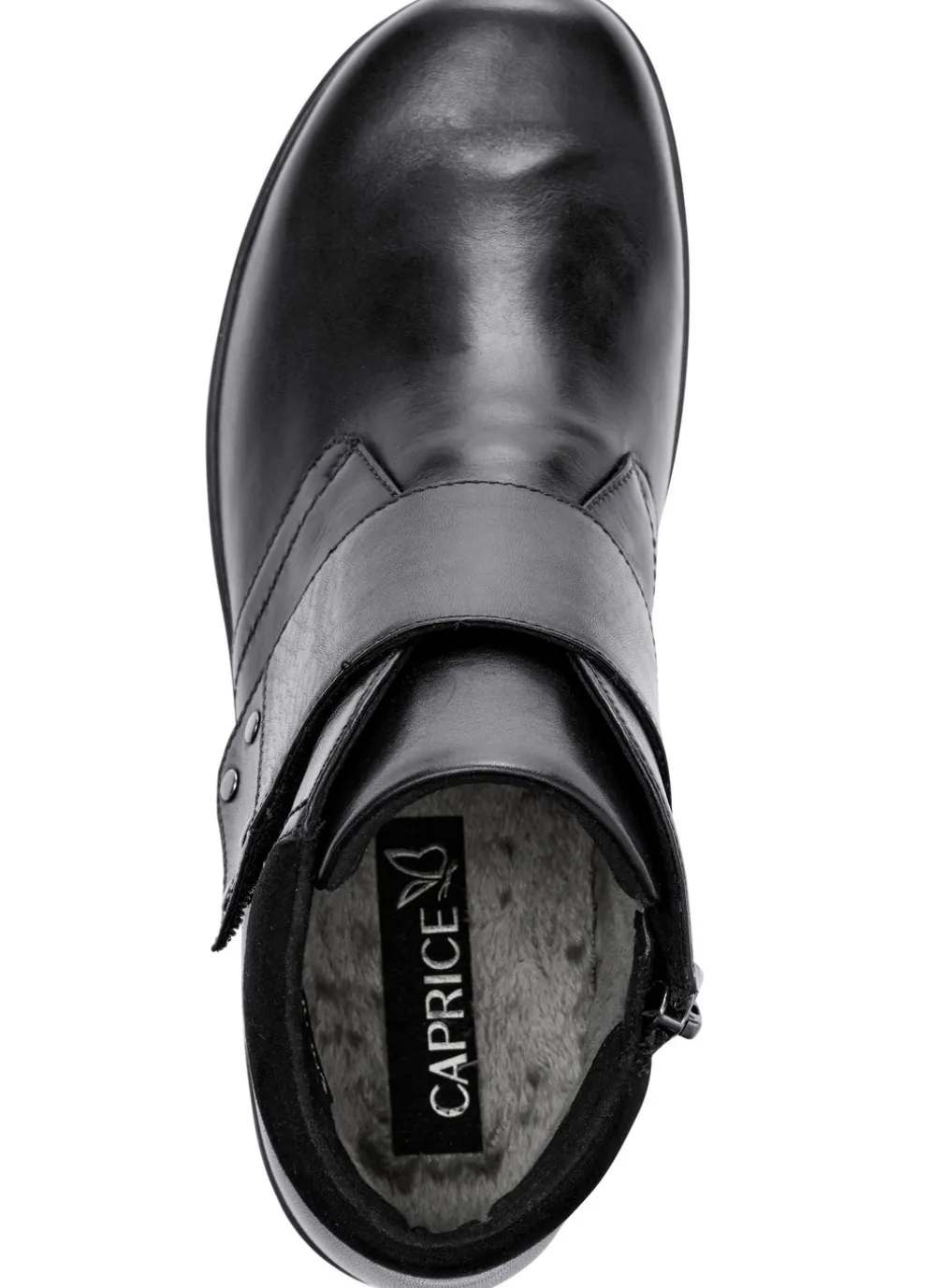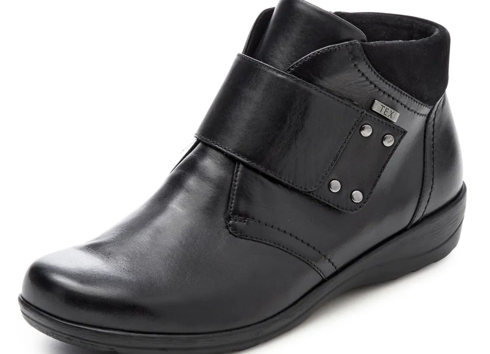 Wetterfeste Boots von ELENA EDEN aus Rind-Nappaleder mit Nubukbesatz: Weite H, mit Klimamembrane ausgestattet, seitlicher Reißverschluss und nietenbesetzte, verstellbare Klettspange mit verdecktem Gummizug, Textilfutter, gepolsterte Decksohle, leichte TPR-Profilsohle sowie 20 mm Keilabsatz