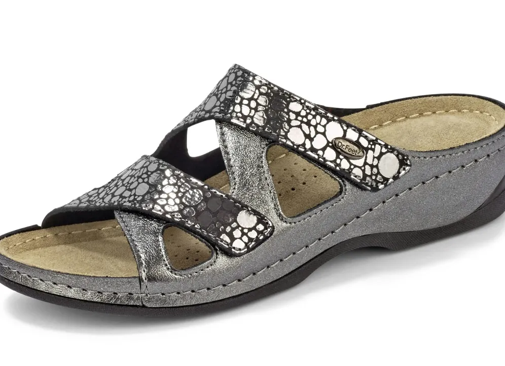 Pantoletten von ELENA EDEN in Anthrazit Metallic, aus teilweise glänzend bedrucktem Rind-Nappaleder: in Weite G, zwei verstellbare Klettspangen, gepolstertes Lederfußbett mit Pelotte und Gelenkstütze, leichte PU-Riffelsohle, 30 mm Keilabsatz