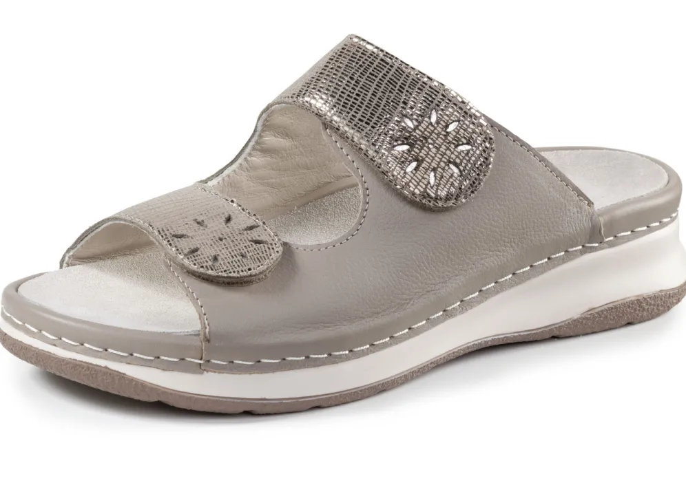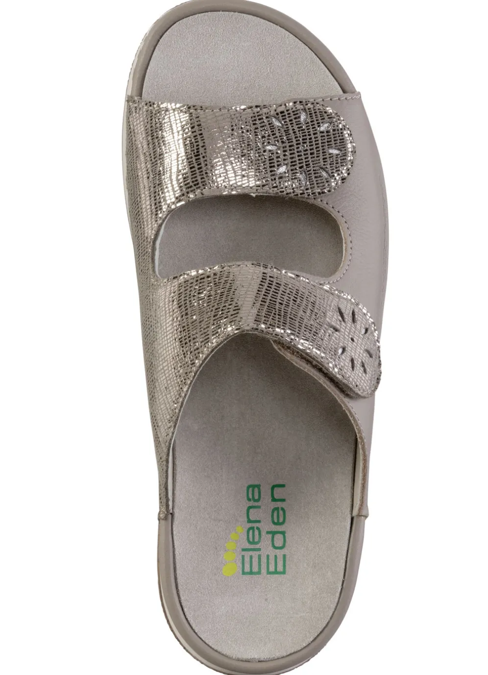 Pantoletten von ELENA EDEN, aus genarbtem Nappaleder und glänzend geprägtem Nubukleder: Weite H, zwei verstellbare Klettspangen, Lederfutter, herausnehmbares Lederfußbett, PU-Profilsohle sowie 20 mm Keilabsatz