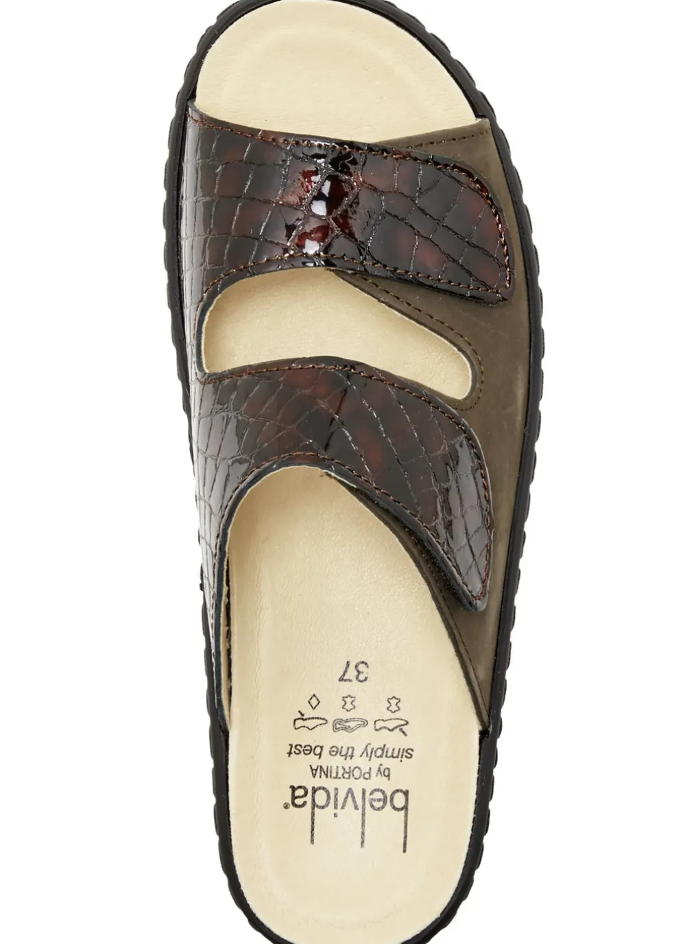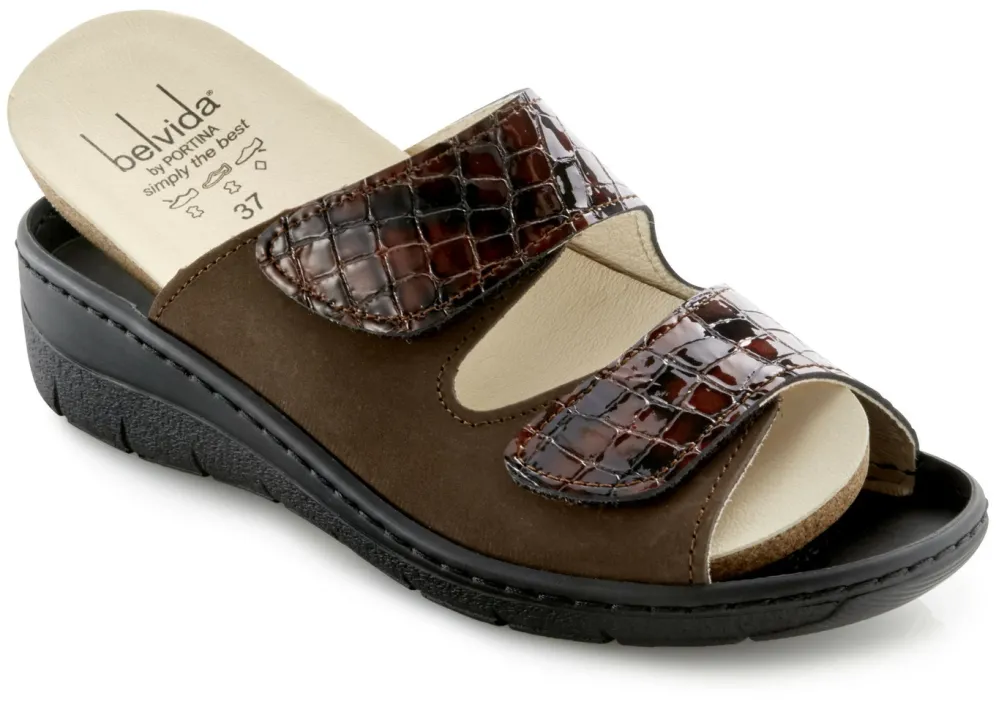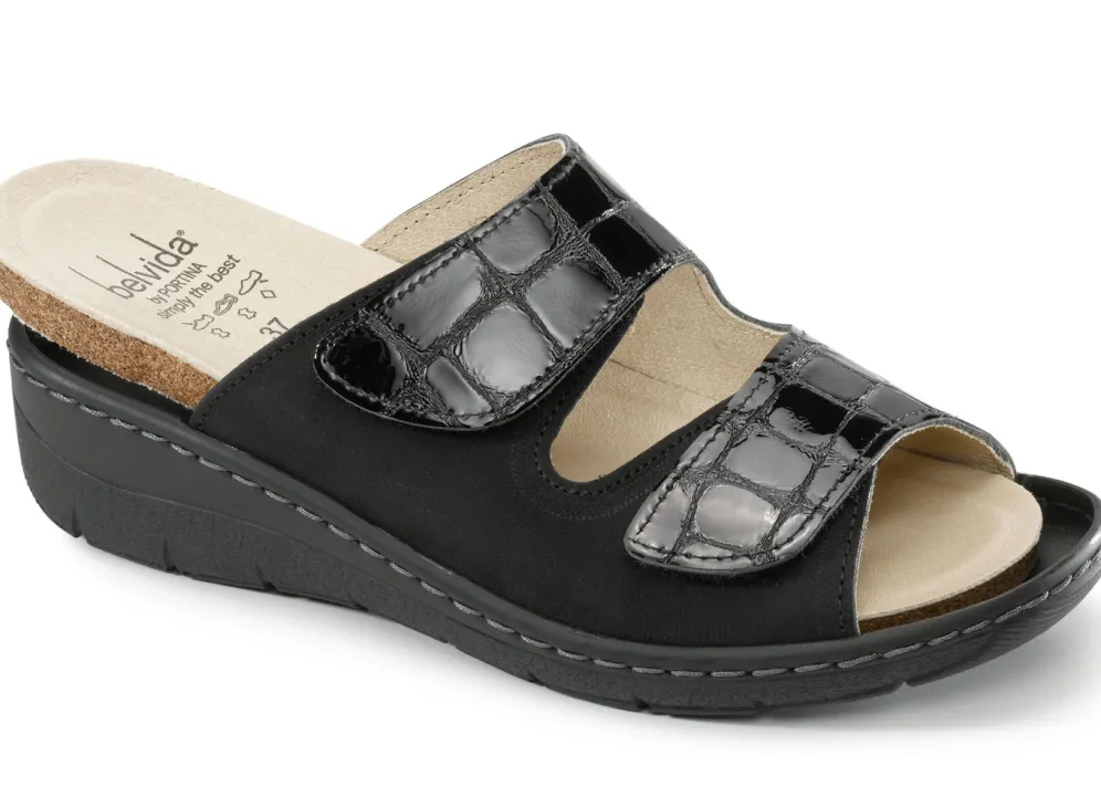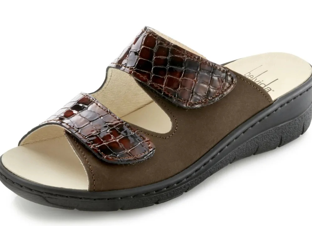 Pantoletten von ELENA EDEN, aus Nubukleder und krokogeprägtem Lackleder: Weite H, zwei Klettspangen, Lederfutter, herausnehmbares Leder-Kork-Fußbett, leichte PU-Laufsohle, 30 mm Keilabsatz