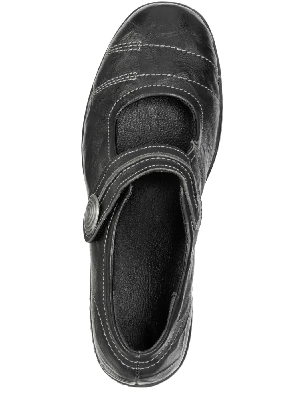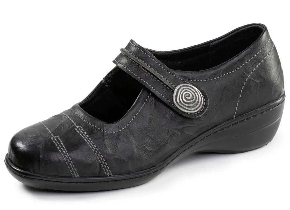 Schwarze Spangenschuhe von ELENA EDEN aus geprägtem Nappaleder mit Knitter-Struktur: Weite H, Klettverschluss mit Metallschmuck, Textilfutter, herausnehmbares Lederfußbett, leichte PU-Riffelsohle sowie 30 mm Keilabsatz