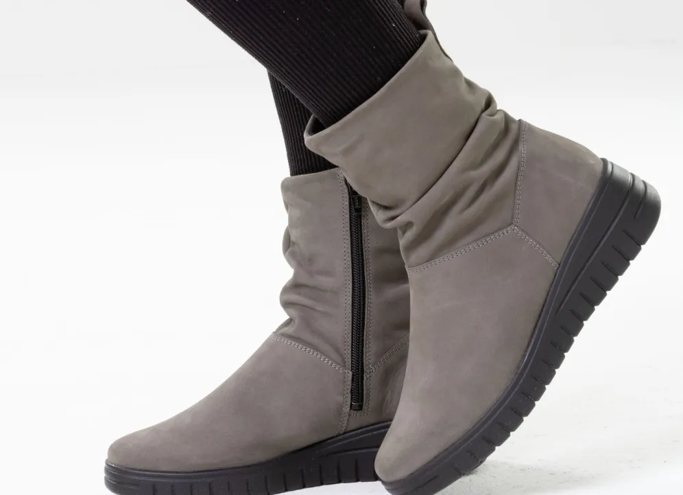 Stiefeletten von ELENA EDEN, aus Nubuk- oder Nappaleder mit Raffung: Weite H, Innenreißverschluss, Textilfutter, herausnehmbares Fußbett, leichte PU-Profilsohle sowie 20 mm Keilabsatz. Schafthöhe ca. 16 cm