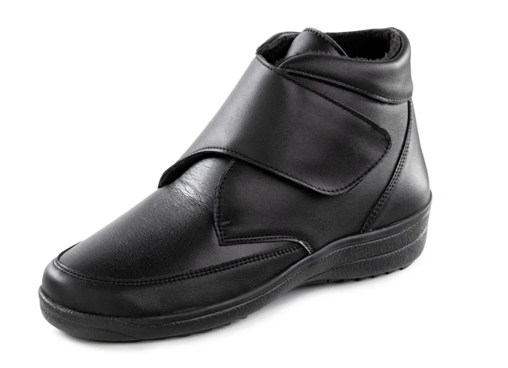 Schwarze Stiefeletten von ELENA EDEN aus Nappaleder und elastischem Synthetik, mit Klettverschluss: Weite H, wärmendes Textilfutter, herausnehmbares Fußbett, leichte PU-TR-Profilsohle, 20 mm Keilabsatz. Schafthöhe ca. 10 cm