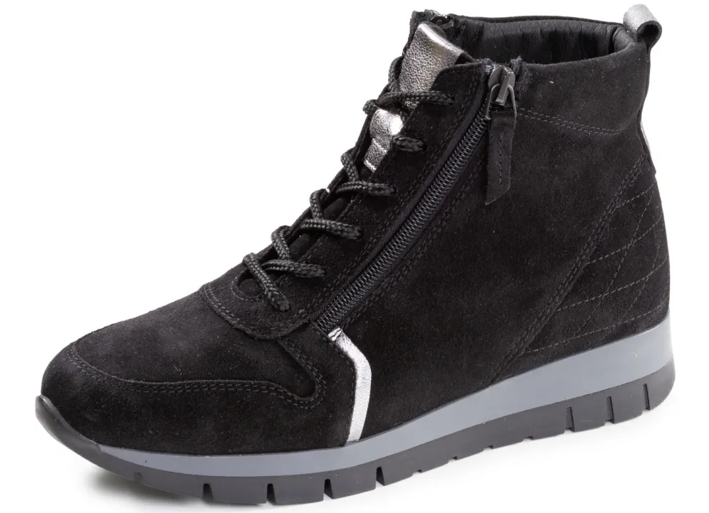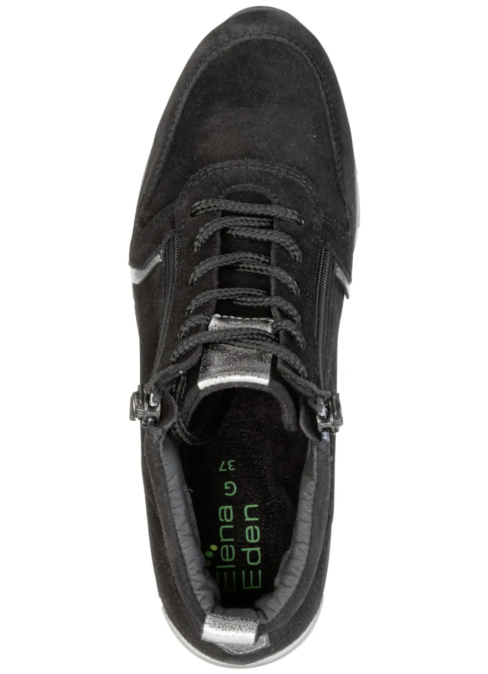Boots von ELENA EDEN, aus Veloursleder, mit glänzend geprägten Besätzen: Weite G, Schnürung, zwei seitlich eingesetzte Reißverschlüsse, wärmendes Textilfutter, herausnehmbares Fußbett, leichte TR-Laufsohle sowie 15 mm Keilabsatz. Schafthöhe ca. 11 cm