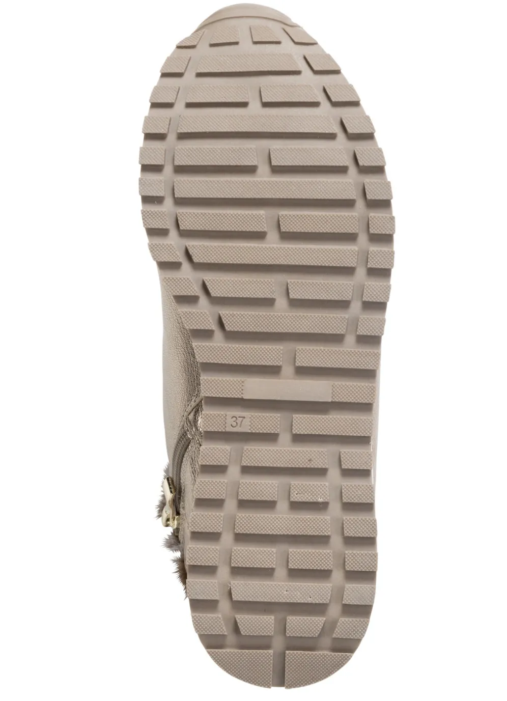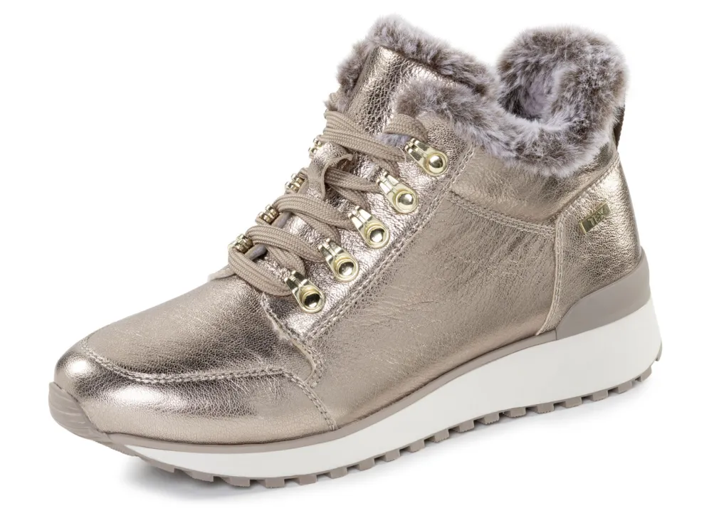 Trendige Boots von ELENA EDEN in Goldbronze, aus genarbtem Nappaleder mit flauschigem Plüschkragen: Weite G, Schnürung, mit Klimamembrane ausgestattet, molliges Warmfutter mit herausnehmbarem Fußbett aus 100% Polyester, leichte TPR-Profilsohle sowie 20 mm Keilabsatz. Schafthöhe ca. 8 cm