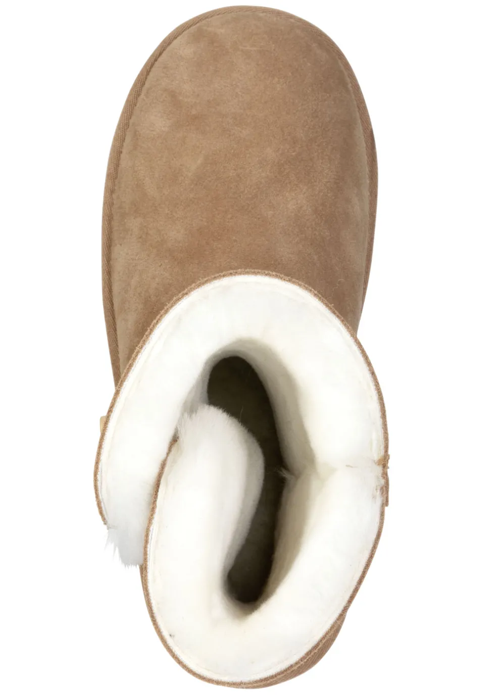 Aktuelle Stiefel von ELENA EDEN aus naturbraunem Veloursleder: Knopfverschluss mit Elastikbändern, flauschiges Warmfutter und Decksohle aus echtem, molligem Lammfell sowie leichte, flache EVA-Gummi-Profilsohle. Schafthöhe ca. 21 cm