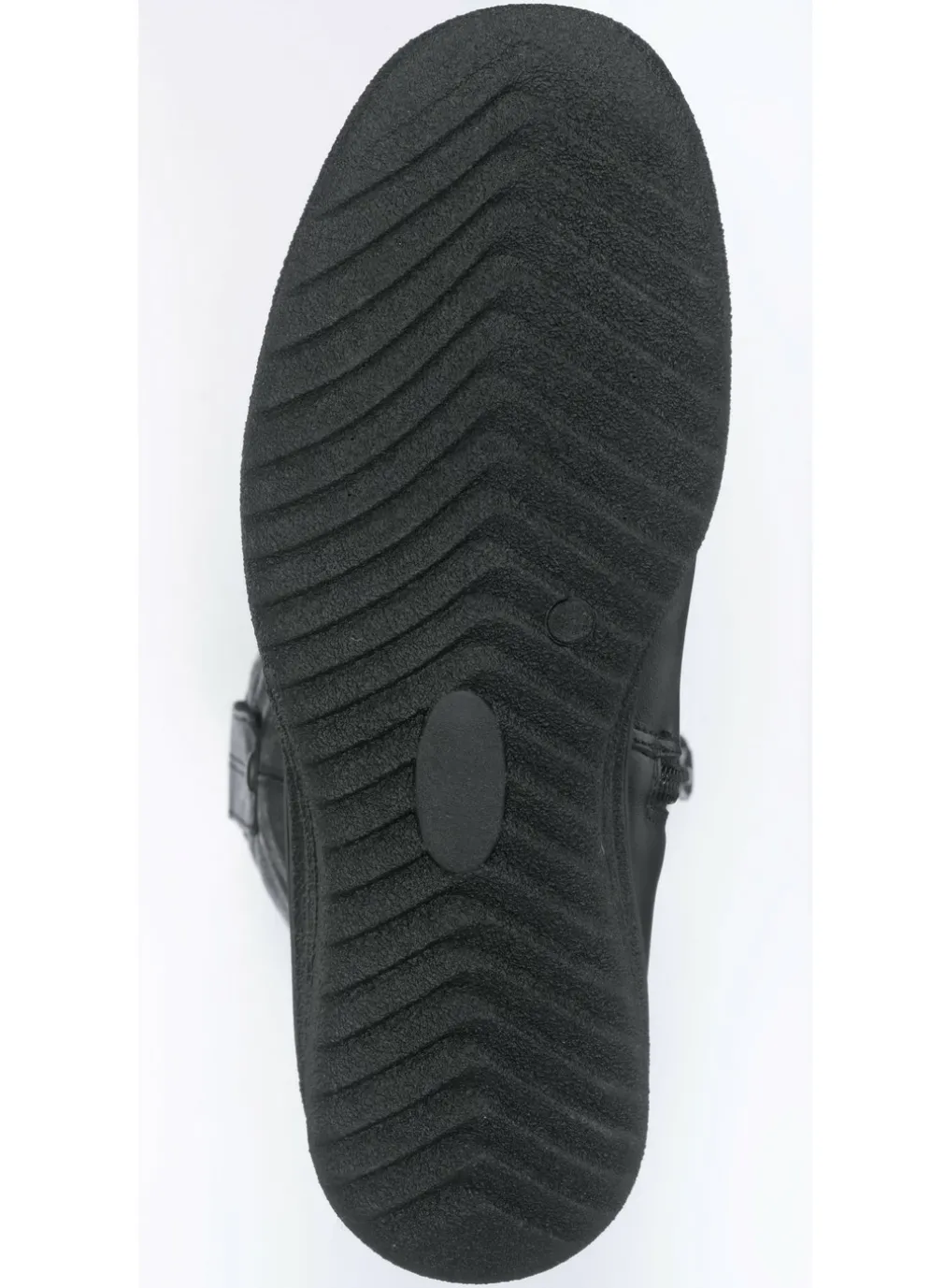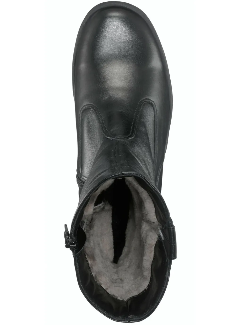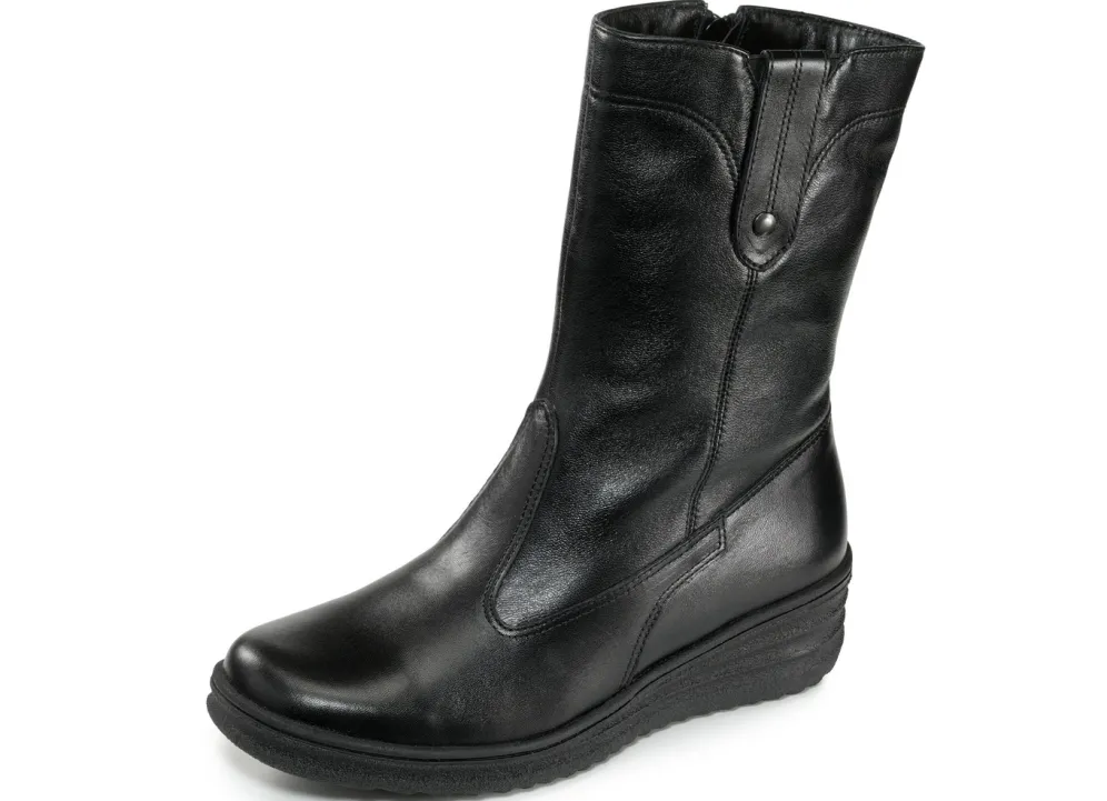 Schwarze Stiefel von ELENA EDEN aus weichem Nappaleder, mit verdecktem Gummizug und Innenreißverschluss: in Weite H, molliges Lammfellfutter, warme Wolldecksohle, leichte Synthetik-Profilsohle, 30 mm Keilabsatz. Schafthöhe ca. 23 cm